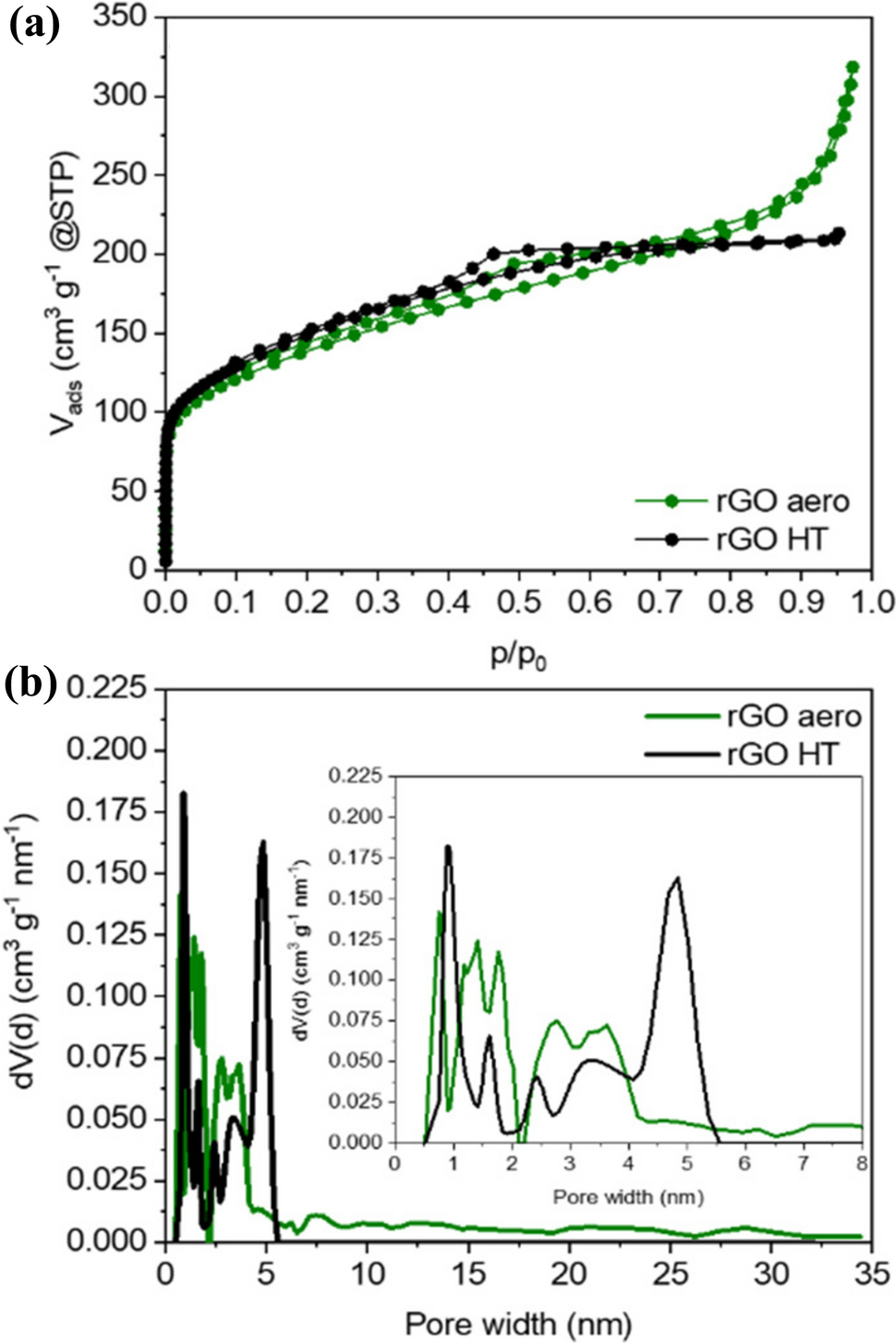 Figure 2 shows the N2 sorption isotherms at 77 K and PSD profiles of the graphene materials. Both the rGO aero and rGO HT displayed a Type IV isotherm with a distinctive hysteresis loop (Fig. 2a) according to the IUPAC classification [30]. As follows from Table 1, the rGO aero had a well-developed porous structure with a BET specific surface area of 495 m2 g−1, slightly higher than the material obtained through the conventional route [31]. Both rGO HT and the rGO aero exhibited comparable contributions of mesopores in the total pore volume (Vmes/Vt = 0.57 − 0.59), however, the rGO aero displayed a significantly higher total pore volume than rGO HT (0.445 vs. 0.324 cm3 g−1). A comparable proportion of micropores and mesopores appears beneficial for efficient supercapacitor operation [32, 33]. Pore size distribution analysis revealed that the rGO aero exhibited pores across a wide range, whereas rGO HT featured micropores and narrow mesopores with a size up to 6 nm (Fig. 2b).