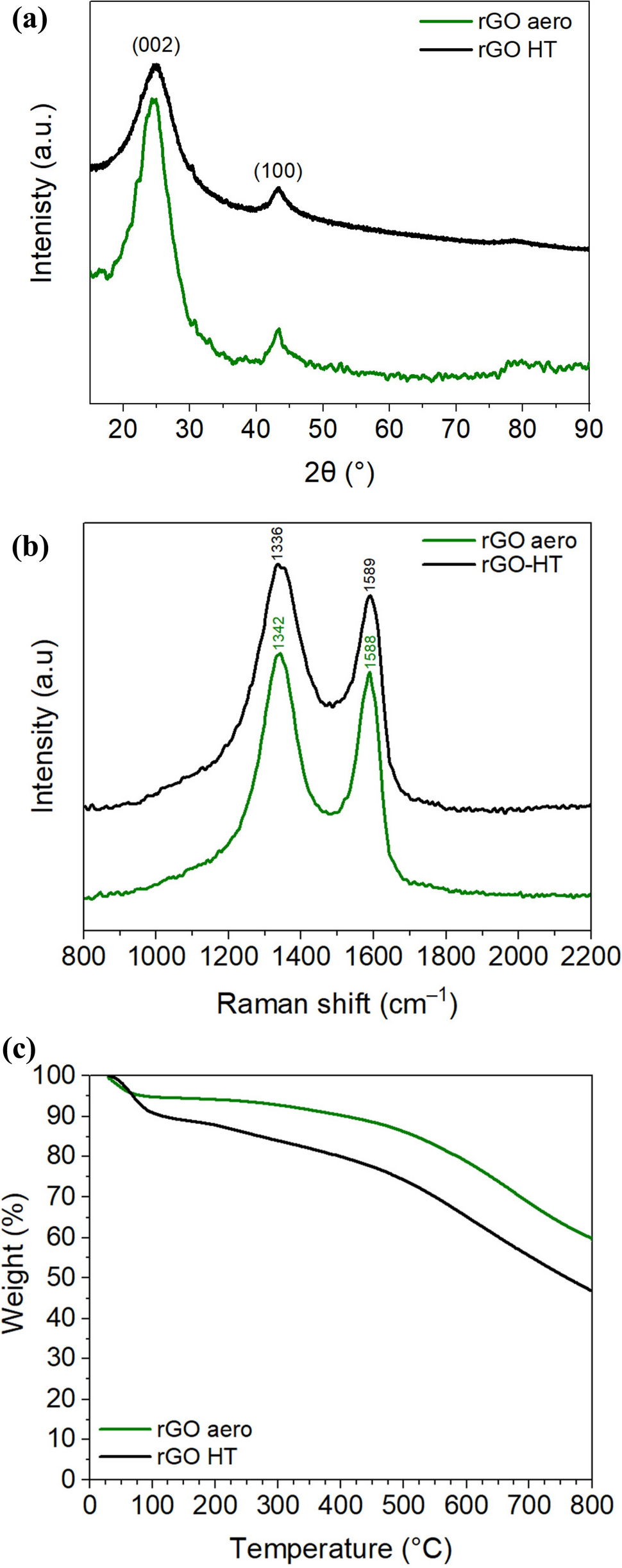 The X-ray diffractograms (Fig. 3a) of the rGO aero and rGO HT exhibit a prominent diffraction peak at 2θ = 24.3° and 24.7°, respectively, corresponding to the (002) lattice plane of a typical graphitic structures. Additionally, weaker peak at 2θ = 43.1° is observed, which is attributed to the (100) plane [34]. The increase in d002 from 0.3604 nm (rGO HT) to 0.3650 nm (rGO aero) results from the minimization of capillary-induced collapse of the graphene structure during freeze-drying, which preserves a more open architecture and increases the spacing between graphene layers [35].