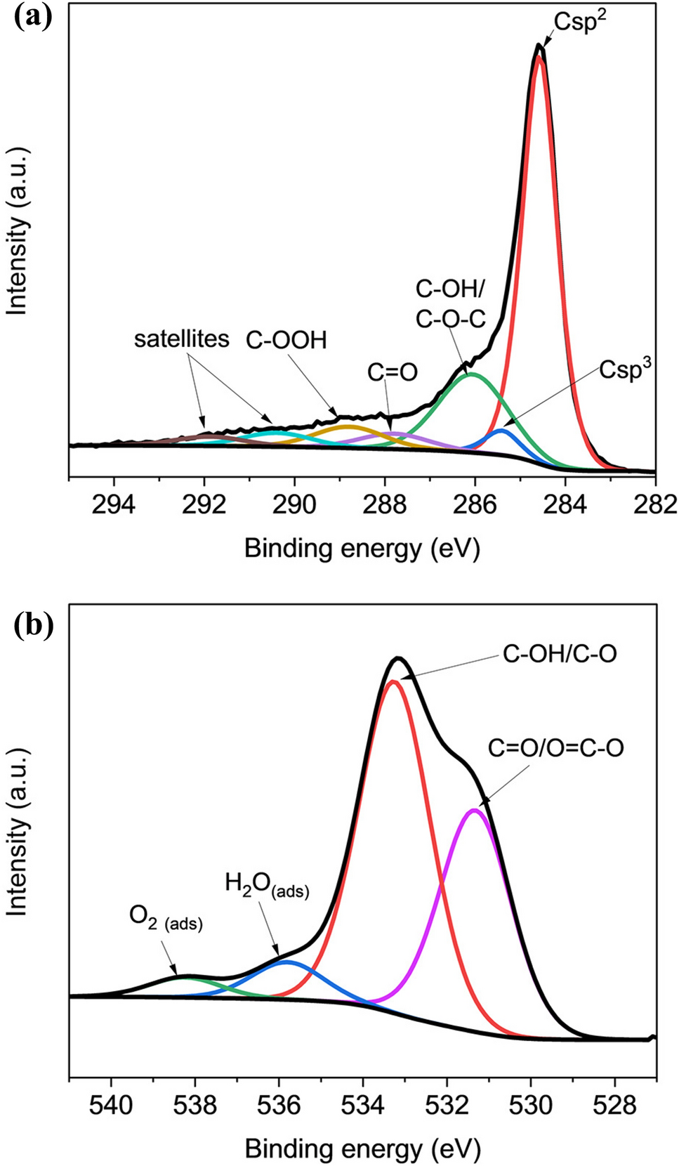 XPS analysis was performed to comprehensively investigate the surface chemistry of the reduced graphene oxides. The XPS survey spectra are shown in Figure S1, revealing the presence of two elements: C and O resulting from the hydrothermal reduction of GO without the use of chemical reductants, further underscores the simplicity of the synthesis process. Detailed information on the binding energies and full widths at half maximum (FWHM) of the C1s and O1s peaks is summarized in Table S1. The surface elemental composition and the functional groups distribution of rGO aero and rGO HT are very similar (Table 2) which suggests that the synthesis method and resulting physical structure did not significantly affect the chemical structure of the rGO surface. The C1s high-resolution spectrum of the rGO aero (Fig. 4a) revealed six components, with a dominant peak corresponding to C–C bonds in a sp2 hybridization (284.6 eV). This confirms the restoration of the graphene hexagonal structure during the hydrothermal treatment of GO [23]. The peak at 285.4 eV is attributed to carbon in the sp3 configuration. Three additional peaks correspond to oxygen functional groups present on the surface of the material: hydroxyl/epoxy (286.1 eV), carbonyl/quinone (287.8 eV), and carboxyl groups (288.8 eV). Satellite peaks for C–C bonds at 290.4 and 291.9 eV are also observed [40].