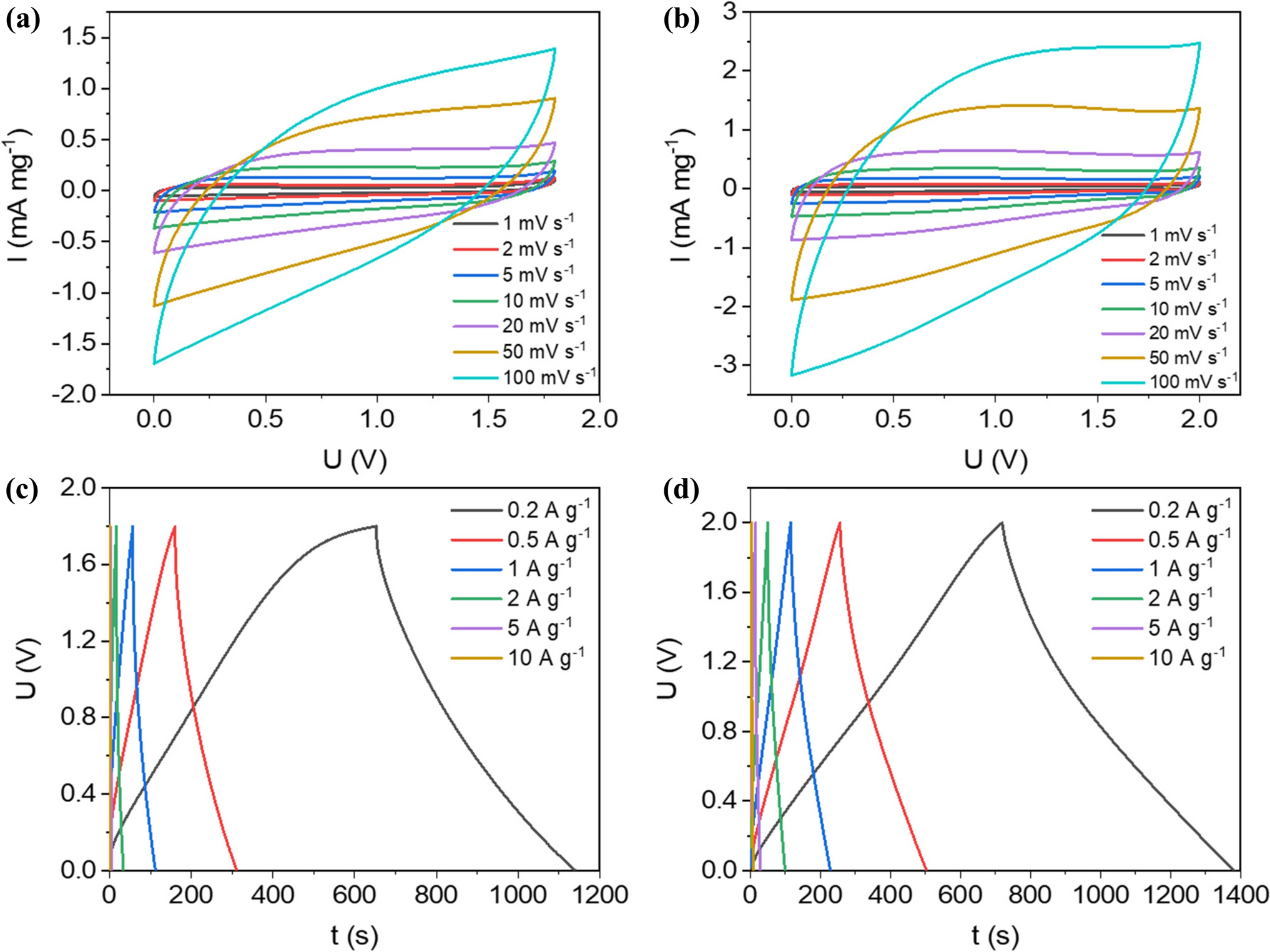 CV curves obtained at different scan rates for rGO HT a and the rGO aero b; GCD curves obtained at different current densities for rGO HT c and the rGO aero d in 1 M Na2SO4.