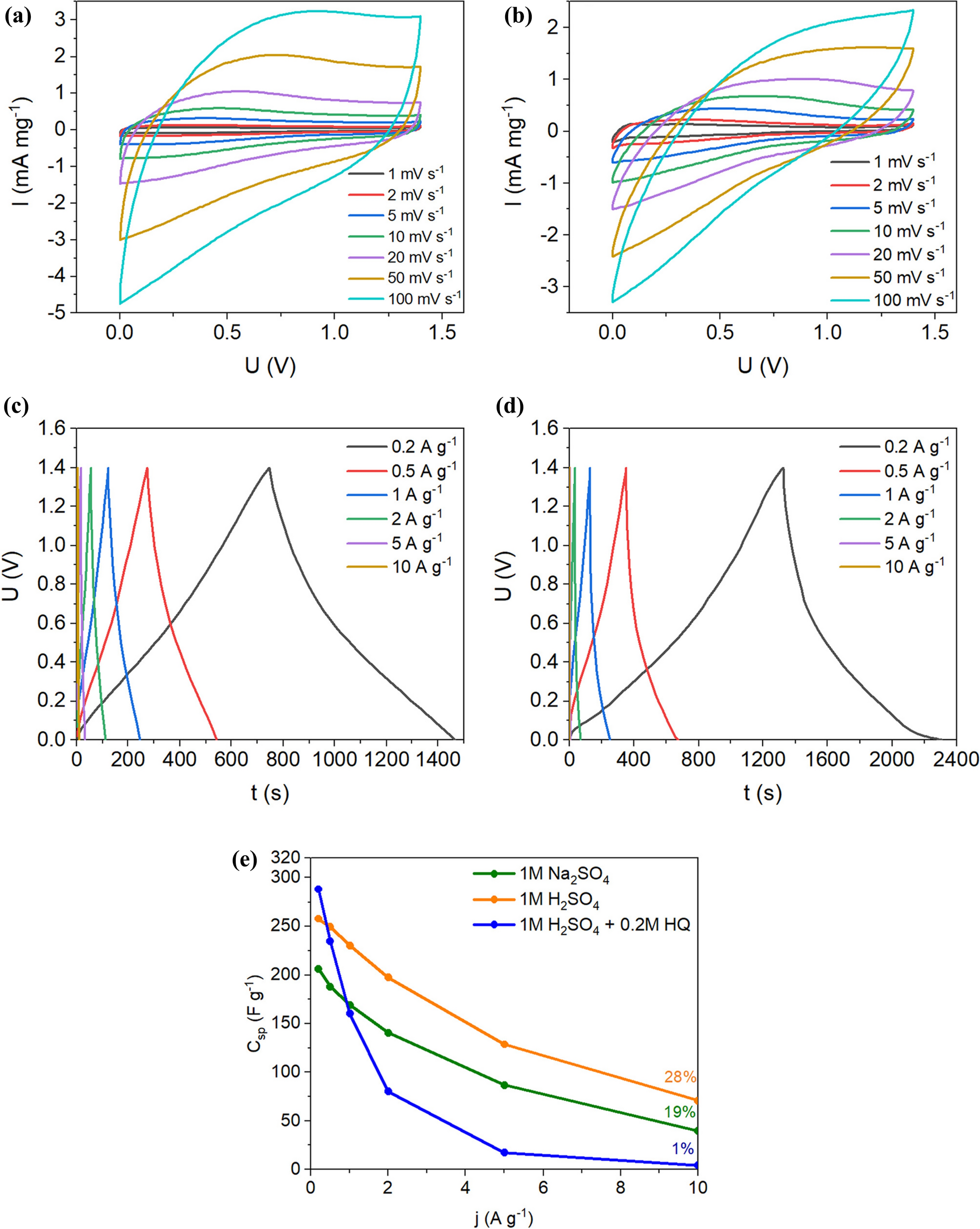CV curves obtained at different scan rates for rGO aero in 1 M H2SO4 (a) and 1 M H2SO4 + 0.2 M HQ (b); GCD curves obtained at different current densities for rGO aero in 1 M H2SO4 (c) and 1 M H2SO4 + 0.2 M HQ (d); specific capacitance versus discharge current densities of rGO-aero based devices operating in 1 M Na2SO4, 1 M H2SO4, and 1 M H2SO4 + 0.2 M HQ (e).