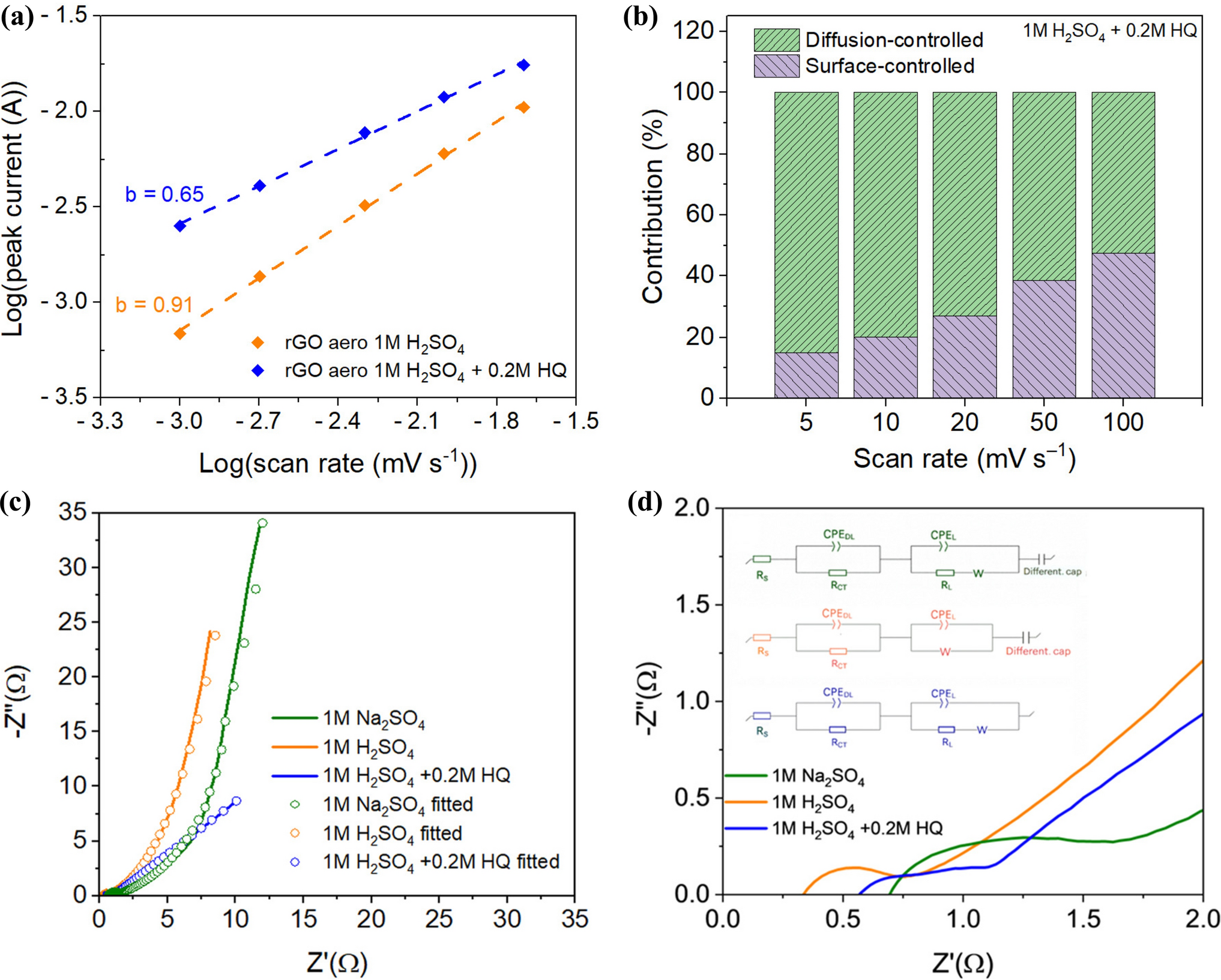 b-values for the rGO aero in 1 M H2SO4 and 1 M H2SO4 + 0.2 M HQ (a). Surface- and diffusion-controlled current contributions for rGO aero 1 M H2SO4 + 0.2 M HQ symmetric system (b). Nyquist plots and their fitting (c) with the high-frequency range magnicfication (d) for the rGO aero–based supercapacitors and inset representing equivalent electrical circuit models of the symmetric devices (from the fitting program ZFIT/EC-lab version 11.41).