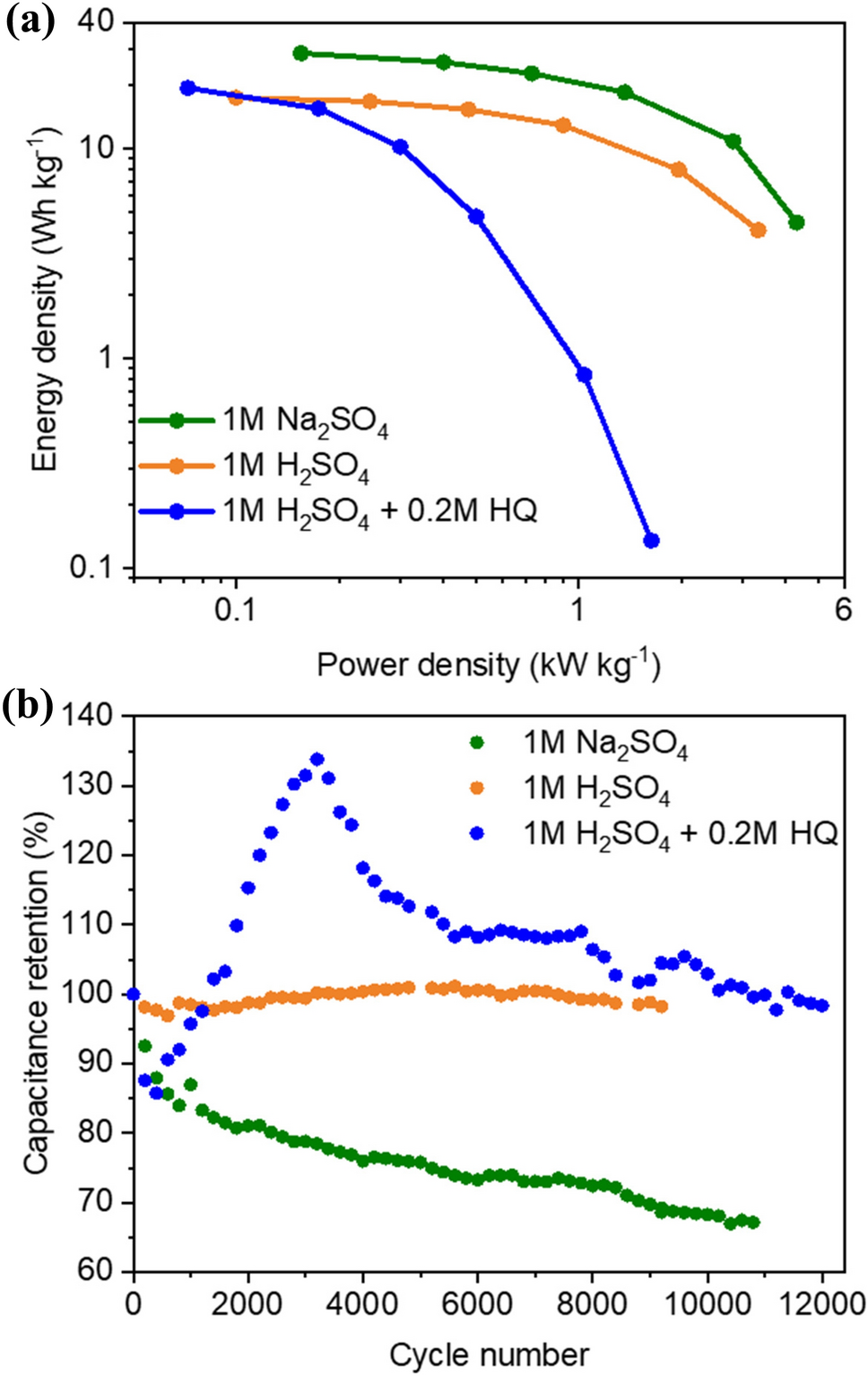 Further evaluations of the symmetric supercapacitors were conducted, focusing on calculated energy and power densities, as shown in the Ragone plot (Fig. 8a). Although the capacitance values are lower, the broad potential window enables the supercapacitor operating in a neutral electrolyte to achieve the highest energy density values. The best setup, employing 1 M Na2SO4, demonstrated impressive electrochemical performance with a high-energy density of 28.5 Wh kg−1 at a power density of 0.154 kW kg−1. In comparison, the devices using 1 M H2SO4 and 1 M H2SO4 + 0.2 M HQ exhibited energy density values of 17.5 and 19.5 Wh kg−1 at power densities of 0.100 and 0.072 kW kg−1, respectively. The observable decrease in stored energy for a device with a redox-active electrolyte above is related to the diminished capacitive capabilities of the setup at higher current regimes, at which the utilization of the faradaic redox reaction of Q-HQ species is significantly hindered. In addition to the high specific capacitance and thus high-energy density, the rGO aero–based devices exhibited outstanding stability during long-term cycling. Figure 8b presents the changes in the specific capacitance vs. cycle number for the assembled supercapacitors at a current density of 2 A g −1. The rGO aero in 1 M Na2SO4 operated within a potential window significantly exceeding the theoretical potential of water decomposition and maintained stability over thousands of cycles. Unfortunately, there was a gradual loss of charge storage capability, and the device reached 67% of its initial capacitance at the end of the experiment. By contrast, the supercapacitor operating in 1 M H2SO4 consistently retains almost 100% efficiency for 10 000 cycles. Furthermore, the device assembled with 1 M H2SO4, and 0.2 M HQ demonstrated outstanding stability, retained 98% of the initial capacity even after 12 000 charge–discharge cycles. Notably, a slight decrease in the specific capacitance value occurred at the initial cycles, followed by an increase in electrochemical capacitance and stabilization. The initial capacity fading observed during the first 1000 cycles can be attributed to the gradual adsorption and stabilization of the HQ species onto the carbon electrode surface. Such adsorption arises from electrostatic and π–π dispersion between the aromatic ring of HQ and the graphene layers, and hydrogen bonding with oxygen-containing surface functionalities. [20, 46]. The stability of the acidic electrolyte enhanced with the redox-active compound surpassed that of the neutral aqueous solution in terms of capacitive properties. Moreover, the combination of 1 M H2SO4 + 0.2 M HQ with the porous rGO aero emerged as a promising setup for high-energy and long-life supercapacitors. However, it is expedient to operate the supercapacitor at a current load not exceeding 1 A g−1.