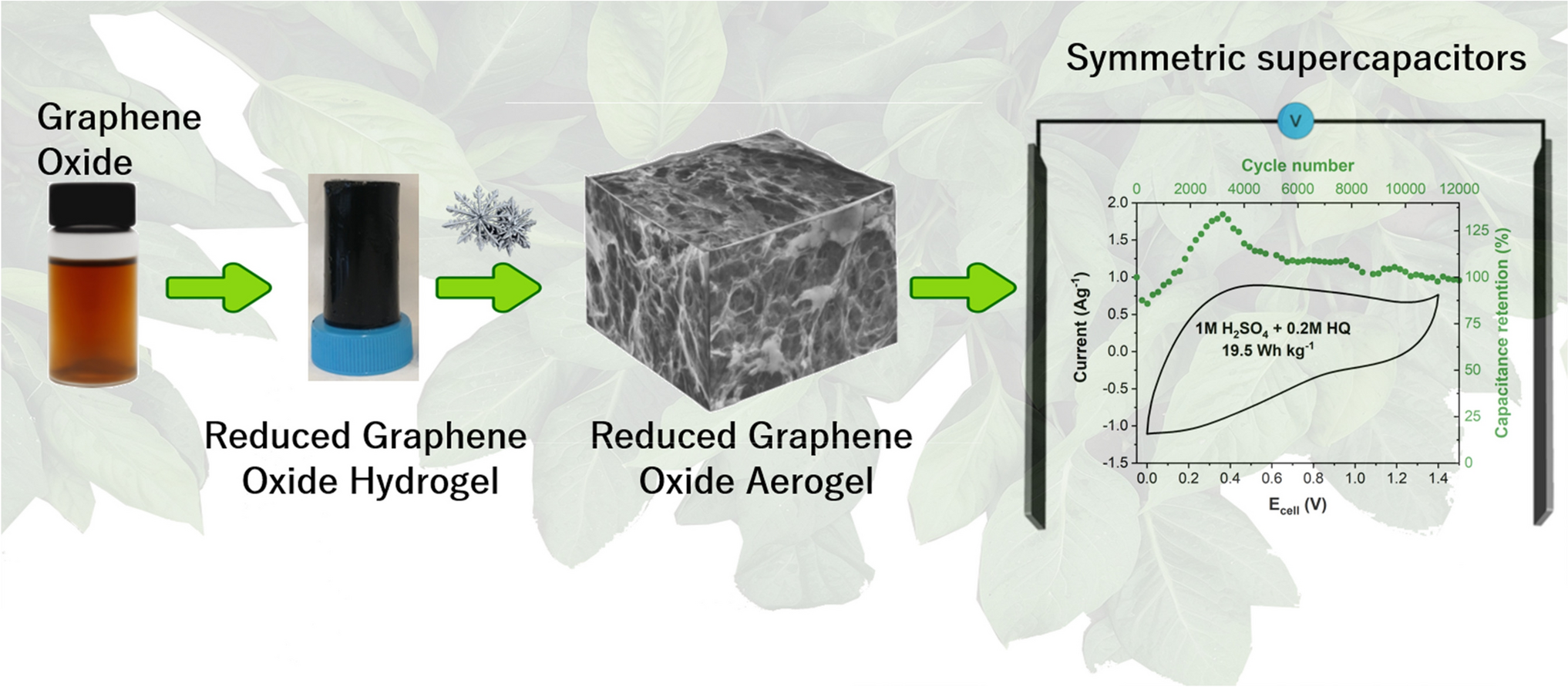In this work, we developed a full two electrode device architecture, where the rGO aerogel (rGO aero), fabricated through a straightforward, scalable and environmentally-friendly protocol (hydrothermal synthesis, water exchange, and freeze-drying), exhibits promising electrochemical performance, which surpasses many more complex materials [17, 21]. Additionally, the aerogel form of rGO demonstrates efficient performance as an active electrode material for symmetric supercapacitor operating in both neutral and acidic electrolytes with extended operational potential range. The core innovation, however, is unlocking superior charge storage capabilities of the hybrid device with undoped graphene aerogel electrodes by modification of an acidic electrolyte with a redox-active additive (hydroquinone), which has not yet been reported [22]. The rGO aero-based two electrode devices delivered a remarkable energy density up to 28.5 Wh kg−1 at power density of 0.154 kW kg−1. The ability to store high energy densities combined with the simplicity of the synthesis procedure and versatility of use make rGO aero a promising material for electrochemical applications.