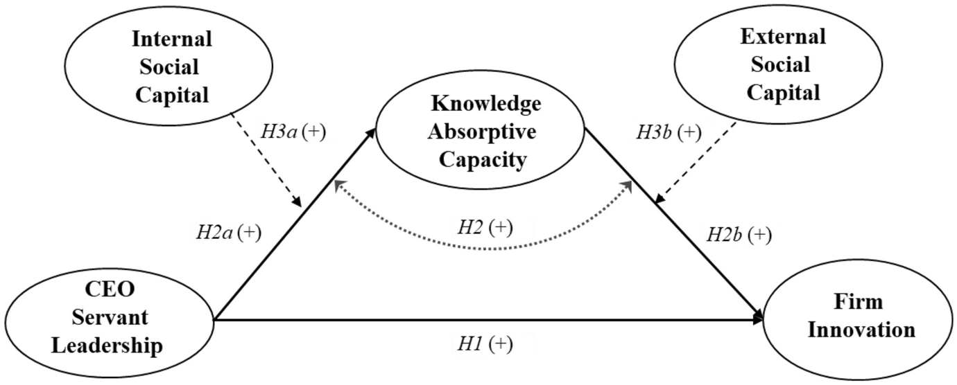 A potential explanatory mechanism of this relationship could be knowledge absorptive capacity (KAC), i.e., the firm’s ability to acquire, assimilate, transform and exploit new knowledge to produce value-added changes in routines, systems and processes (Cohen & Levinthal, 1990; Zahra & George, 2002). This capability and internal functioning is linked to innovation (Xie et al., 2018), which may be fostered by the practice of servant leadership at the head of firms, given the strong emphasis this leadership style places on the need to create value for society, empower employees and support and listen attentively to all stakeholders’ needs, including those of employees. Furthermore, given that innovation emerges as a process of interaction between the relationships that occur inside and outside the firm (Shalley et al., 2009), firm KAC and innovation could also require processes of social interaction for their correct formation. Furthermore, drawing on Kerr and Jermier’s (1978) substitutes for leadership theory, inaccurate conclusions about the impact of servant leadership on firm innovation are possible if researchers fail to consider the contexts in which leadership behaviours occur. Thus, the extent to which social capital (internal, external) is present in firms may help strengthen the relationship between CEO servant leadership and firm innovation via KAC that we seek to explore in this study.