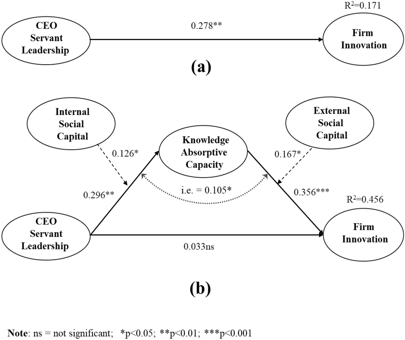 CEO Servant leadership → Knowledge Absorptive Capacity → Firm Innovation | 0.456 | 0.171 | 0.285 | 0.524 (large effect) |