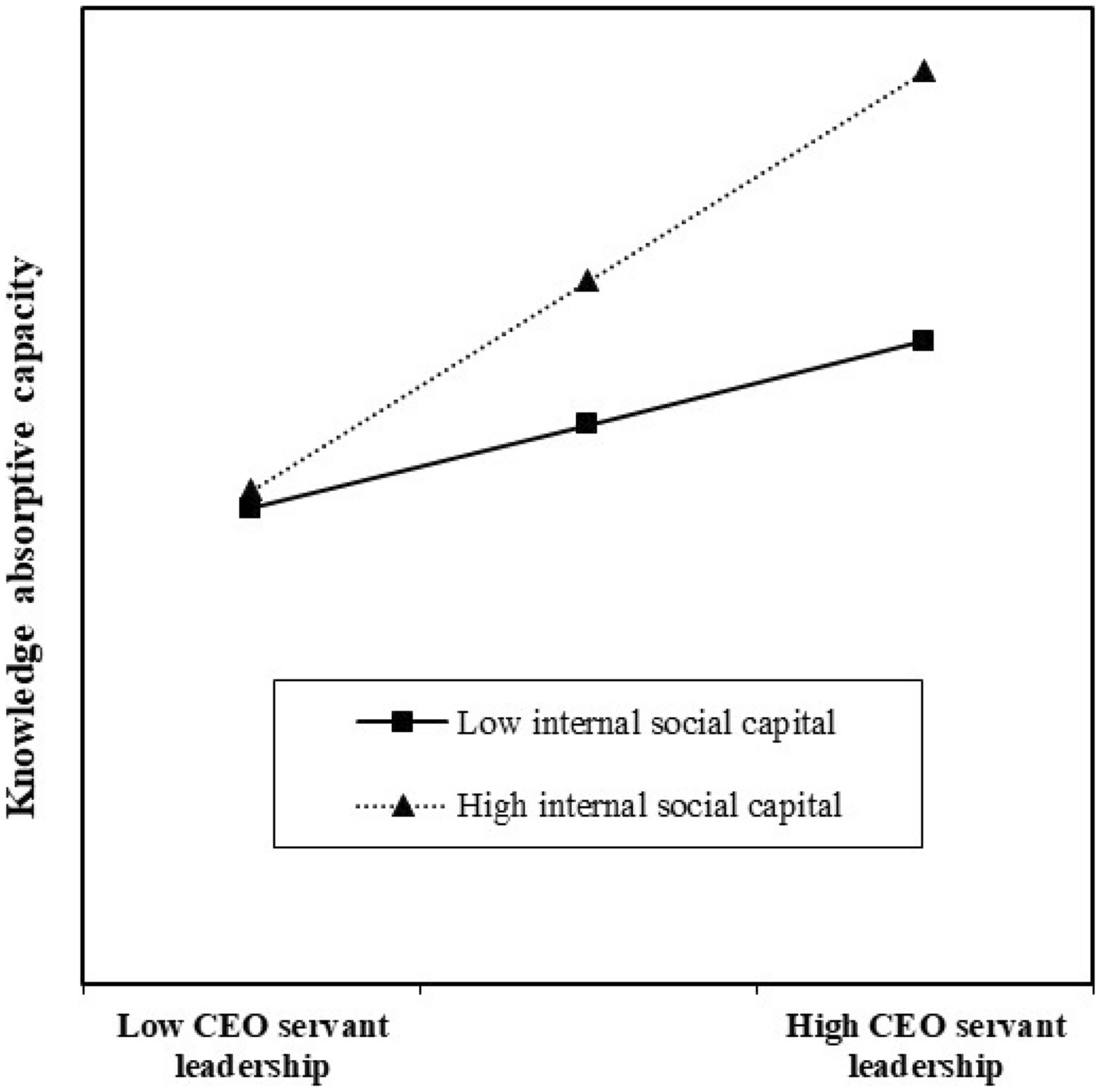 Although CEO servant leadership may explain the development of a firm’s KAC, the valuable organizational resources that can be provided through internal social capital (Leana & Pil, 2006) are also important for firms to develop KAC (Ortiz et al., 2021). Indeed, while servant CEOs’ emphasis on building a sense of community, as well as their interest in empowering organizational members, can foster KAC, internal social capital generates the structure for this to occur in a more consistent and agile way. For example, with increased internal social capital, workers will be connected, know each other and frequently share information (structural social capital), trust each other, identify with and feel an obligation to help each other (relational social capital), and have a common understanding of collective goals (cognitive social capital) (Linuesa-Langreo et al., 2018). As such, the sense of community will be more easily established and empowered employees in the organization will find it simpler to acquire, assimilate, transform and exploit external knowledge (KAC). Indeed, firms that develop higher levels of internal social capital increase the likelihood of organizational members generating and finding the knowledge and information required to solve problems (Leana & Pil, 2006), such as those related to adapting to the complex environment. This is because higher levels of social interaction, trust and shared understanding within the organization (i.e., internal social capital) promote the exchange of information and the establishment of shorter network paths between units and persons (Tsai & Ghosal, 1998). Therefore, internal social capital enables firms to build capabilities that allow them to acquire, assimilate, transform and exploit externally/internally acquired information (Hughes et al., 2014), such that internal social capital is likely to strengthen the positive impact of CEO servant leadership on KAC. Thus,