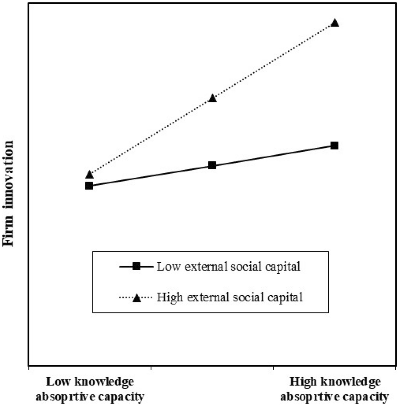 We proceeded similarly in the analysis of H3b. First, as predicted, the relationship between KAC and firm innovation was strengthened by the existence of external social capital (β = 0.167, p < 0.05; Fig. 2b). Second, when we plotted high versus low external social capital regression lines, the positive relationship between KAC and firm innovation was stronger (the slope is more pronounced, Fig. 4) when firm external social capital was high rather than low, in support of H3b.