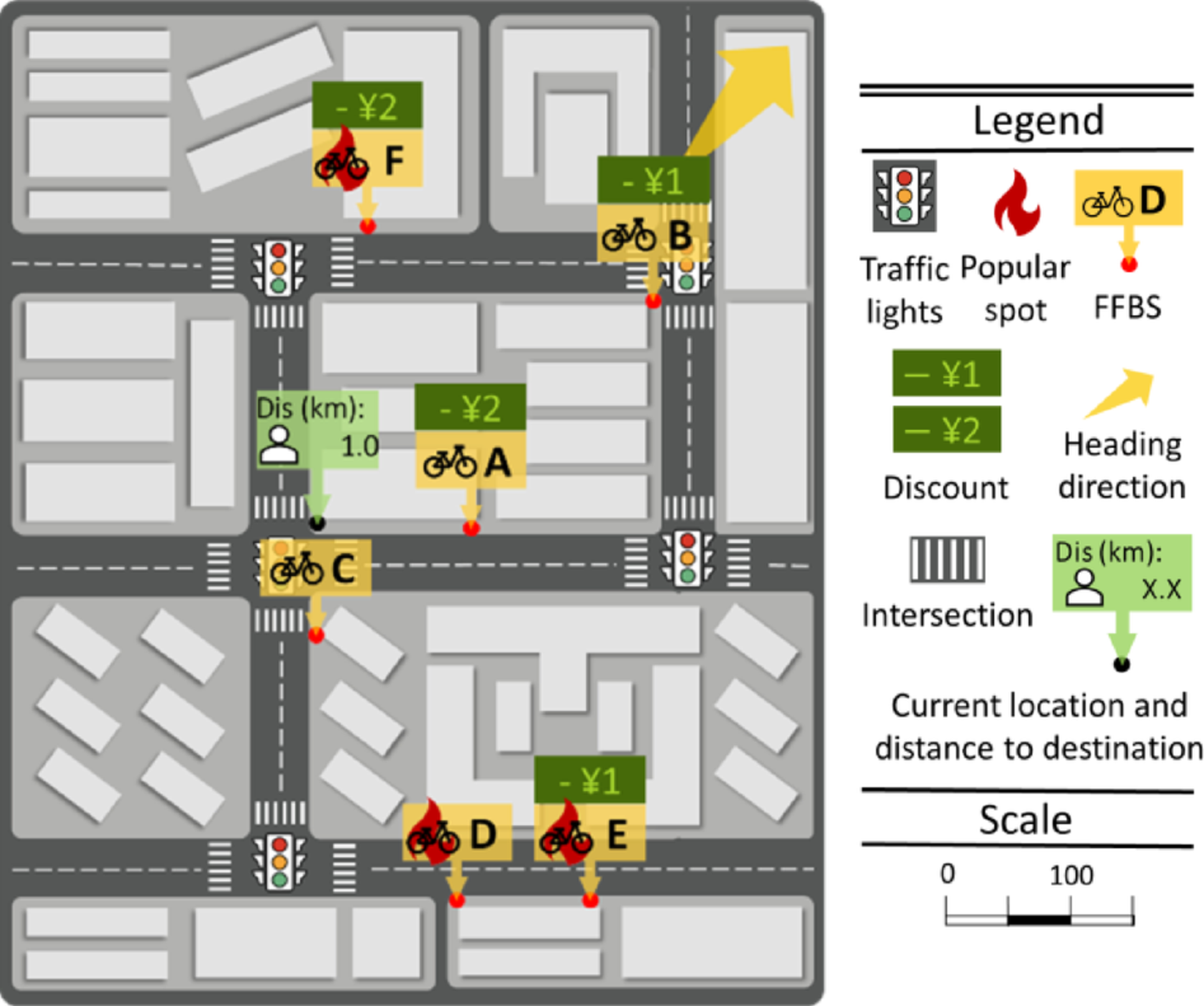 Before presenting app-screenshot mimics and related choice questions, a short demonstration of the task is presented to the respondent, as shown in Fig. 1. Respondents are instructed to understand the map and legend, and the attributes they need to consider. All the ‘screenshots’ have the identical street map, the traveller’s origin and heading direction. Regarding “heading direction”, since the destination is presumed to be outside the local map, it is presented with an arrow (see middle top in Fig. 1 as well as Fig. 2). A legend is also provided for each figure. A short message describing the distance to the destination and the reservation time allowed in this scenario is presented together with each map figure. In the series of figures provided to the respondents, six bicycle locations are randomly generated with different locations and discounts attributes. Bicycles are only located along the street and in each scenario, the bicycles are generated in such a way that avoids cases where one bicycle is the dominant option, i.e. closer, cheaper and less popular. We define cases where a specific bicycle is the obvious choice as ‘anti-bot scenarios’, designed to filter out invalid responses and improve data accuracy. Figure 2 provides an example. Here, bicycle A is clearly the most attractive option. If the respondent repeatedly chooses a different bicycle, we judge that the respondent does not pay attention to the question or has not understood the choice task.