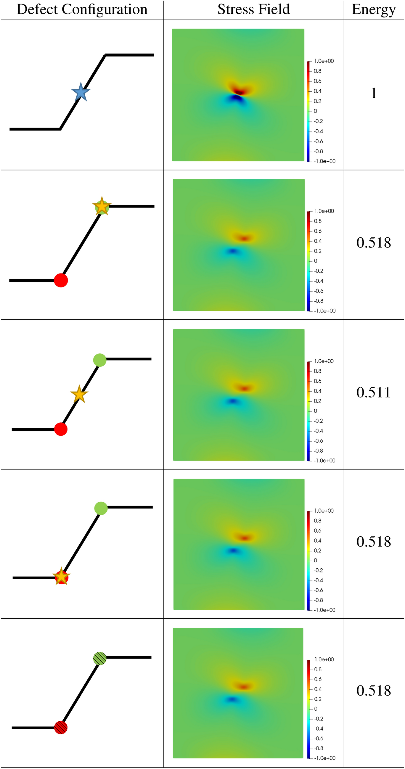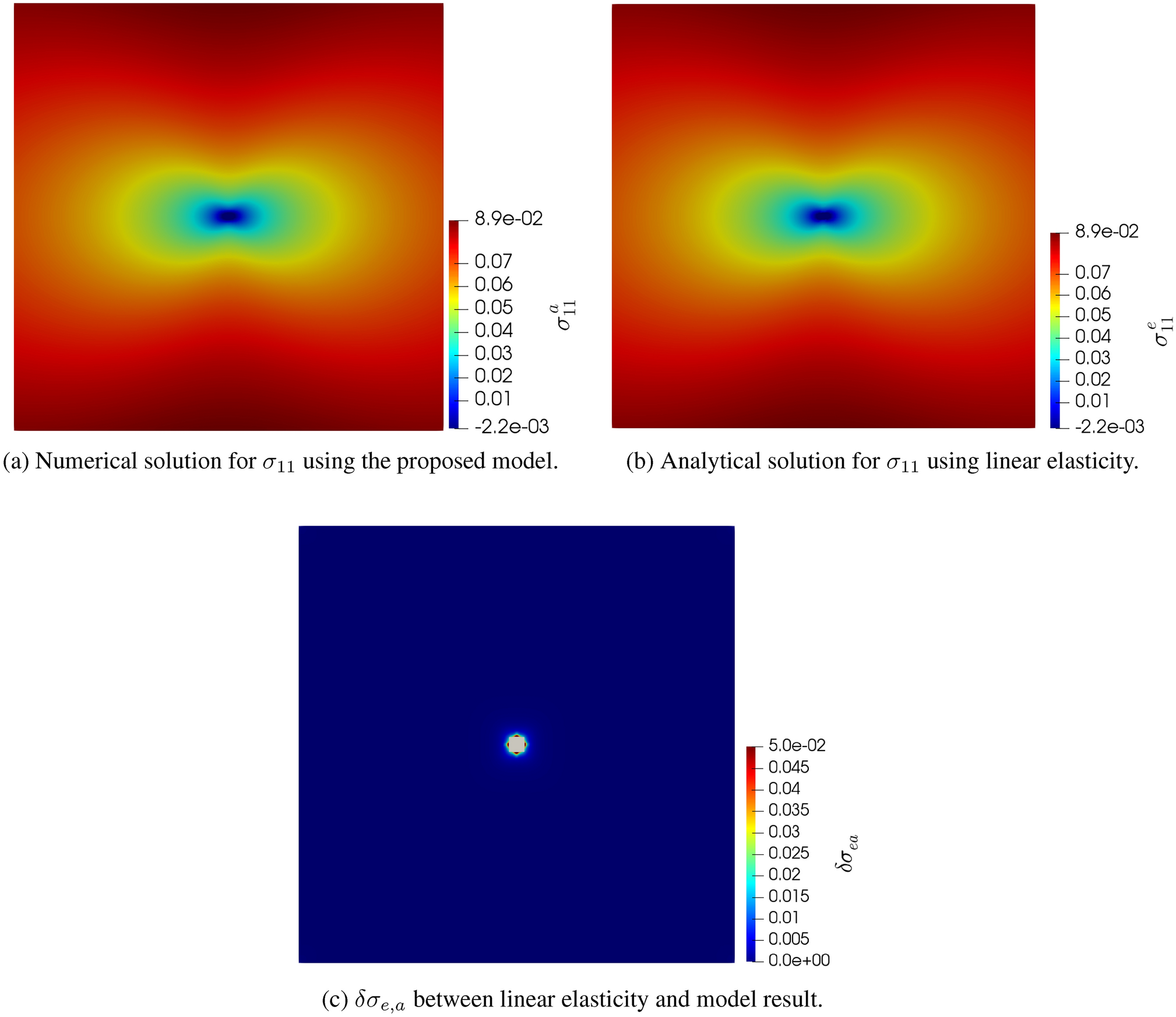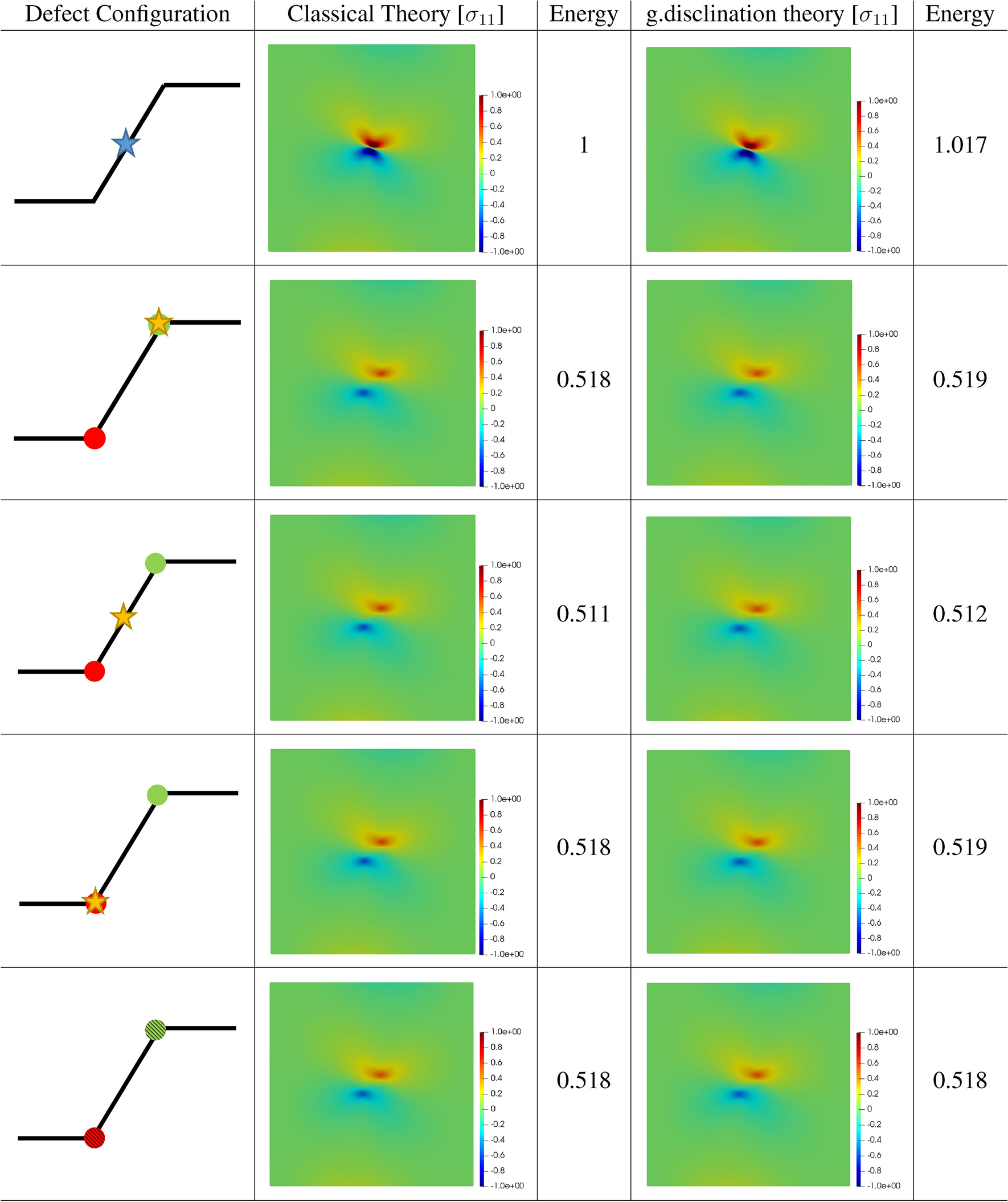 The stress for this case is shown in Fig. 6. As can be seen, both pictures are almost indistinguishable, while, with the exception of the vicinity of the defect core, the difference between both field, in the sense of (1.1), is noticeably smaller than \(5\%\). Due to the current framework considering finite-size cores and the analytically solution considering an infinitesimal one, the difference in the vicinity of the core is, expectedly, large.