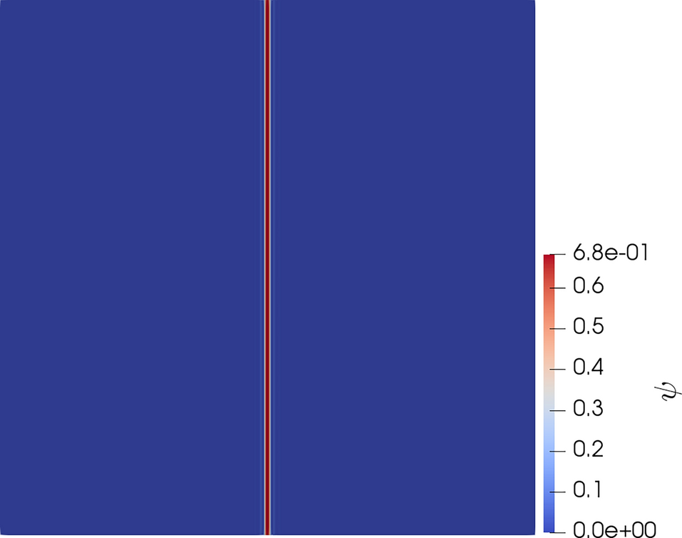 In light of the previous plot, and keeping in mind the observations in [4, 21, 30], it is also worth studying the effect of applying a constant shear on the boundary of a body containing a twin. The described setup is shown in Fig. 34, the value of the shear applied on the boundary is G/1000 and the twin parameters remain the same (Fig.35).