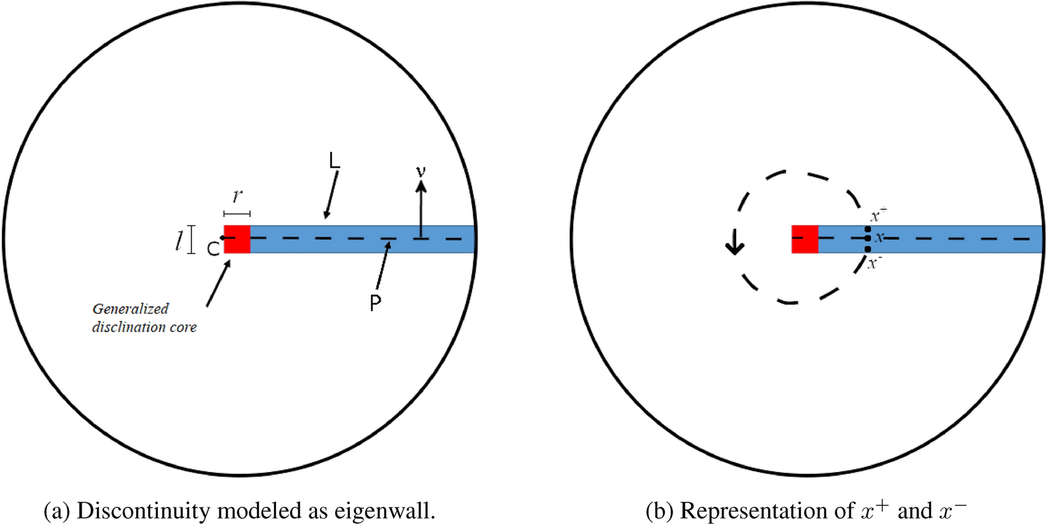 Developed as a generalization of the eigenstrain theory of Kröner, Mura and deWit [11, 18, 19], a g.disclination is a curve that terminates a discontinuity of elastic distortion on a surface. This discontinuity is modeled by an eigenwall field with support in a layer that terminates inside the body, as shown in Fig. 1. In the general case, the continuous elastic 2-distortion field is assumed to be irrotational outside the generalized disclination core and the generalized disclination strength is defined as the second order tensor obtained by integrating the 2-distortion field along any closed curve encircling the core.