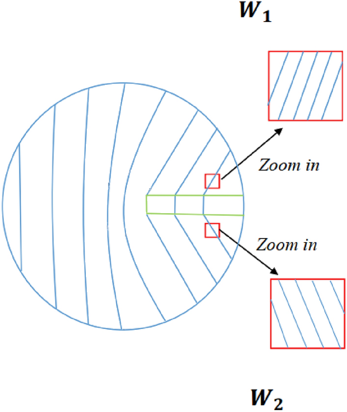 After the considerations for \(\varvec{\alpha }\), the final step of the procedure, as outlined in [34], is to define \({\varvec{S}}\) in a form that is consistent with (2.1). This is accomplished by considering the i-elastic distortion field of the upper part of the body as \({\varvec{W}}_{1}\) and that of the lower part as \({\varvec{W}}_{2}\), as sketched in Fig. 2. For all disclination problems treated in this work, given a misorientation angle \(\theta\), we assume \({\varvec{W}}_{2}\) to be the identity tensor \({\varvec{I}}\) and \({\varvec{W}}_{1}\) is defined by the rotation tensor given by the angle \(\theta\). Within the small deformation framework we can use the approximations \(cos(\theta )\approx 1\) and \(sin(\theta )\approx tan(\theta )\), then \({\varvec{W}}_{1}\) is given by