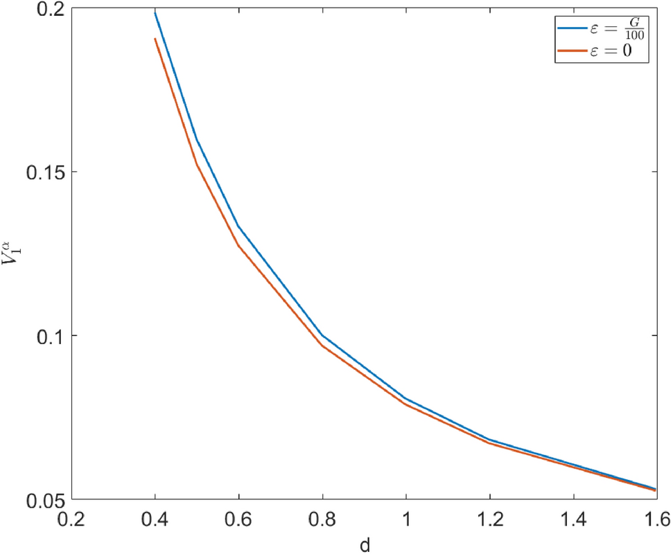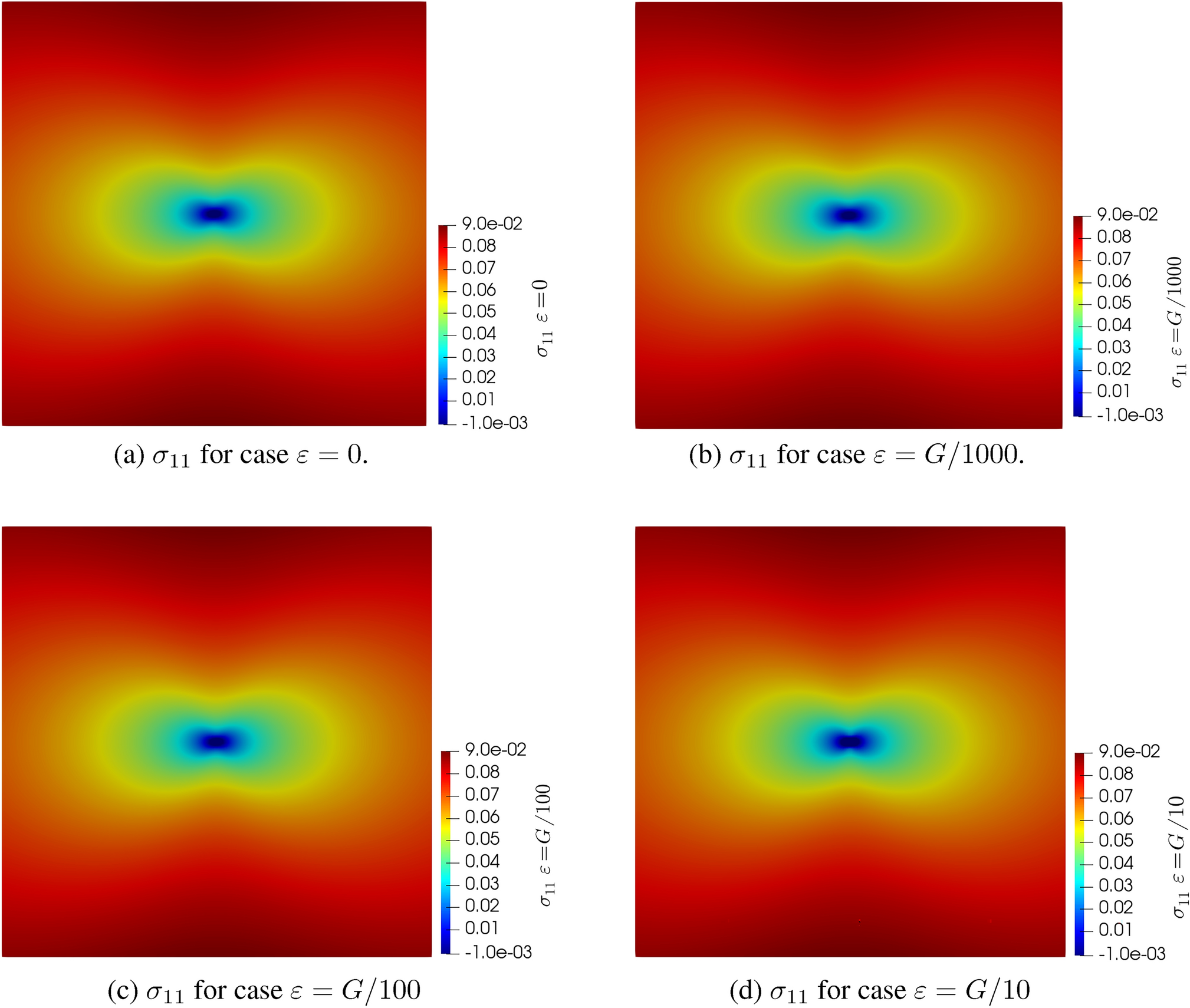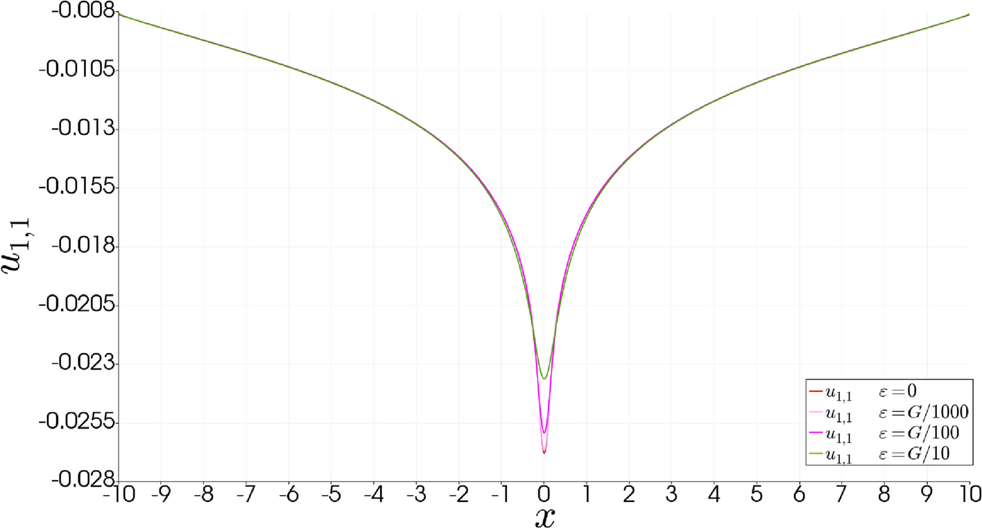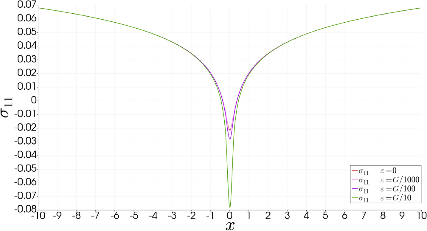 An interesting question that arises in an example like this is what the effect of couple stress is in the stress field. To answer this, this same model will be solved varying the parameter \(\varepsilon\) in the following set, \(\varepsilon = \left[0, G/1000, G/100, G/10 \right]\), with appropriate units. The solution for these cases can be seen in Fig. 7, as before, all pictures look indistinguishable from each other, however, in Fig. 8 we can see the graph of \(\sigma _{11}\) on a cut along the x-axis, where it can be appreciated that an increase on the value of \(\varepsilon\) results in an increase of the value and the gradients of the stress around the core, while almost no changes occur on the bulk.