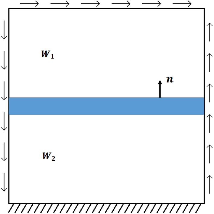 In the following section we solve a set of numerical examples to show the feasibility of using the proposed framework. All problems are solved in the small deformation setting. All problems are solved in a 2D domain, which is meshed with a quadrilateral mesh. In all examples the horizontal and vertical directions match the vectors \({\varvec{e}}_{1}\) and \({\varvec{e}}_{2}\), respectively. All problems consider material parameters to be \(G=1\) and \(\nu =0.33\). The parameter \(\varepsilon\) is related to G through the relation \(\varepsilon =G\,l^{2}\), where l is a characteristic length of the material. All problems consider a value of \(\varepsilon\) such that \({\varepsilon }/{l^{2}}=G/100\), unless noted otherwise. Most problems are solved on a domain with physical dimensions \(L_{x}\) and \(L_{y}\) equal to \(20\times 20\) lattice units. When an example deviates from these default parameters, the actual values used will be stated in the problem set-up. All problems have been implemented in PETSc ([2, 3, 5]). To implement the required basis functions and spline based meshes for IGA, the library PetIGA was used ([10]).