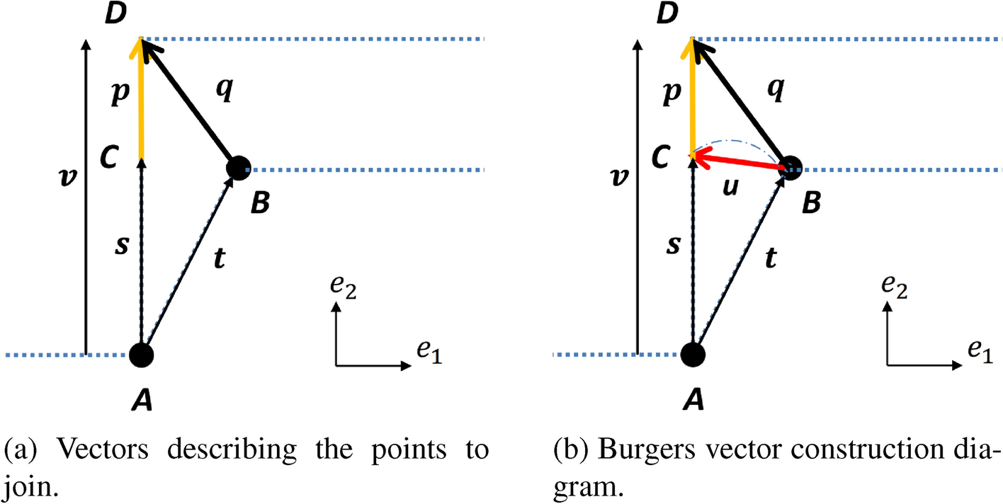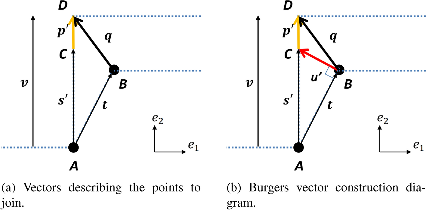 To calculate the new Burgers vector for the dislocation, \({\varvec{p}}^{\prime }\), we can write \({\varvec{q}}={\varvec{u}}^{\prime }+{\varvec{p}}^{\prime }\), and recalling the previous definitions we have \({\varvec{q}}=\varvec{\varDelta }\,{\varvec{t}}+c{\varvec{e}}_2\). Noting that, in the small deformation setting, the tensor \(\varvec{\varDelta }\) is