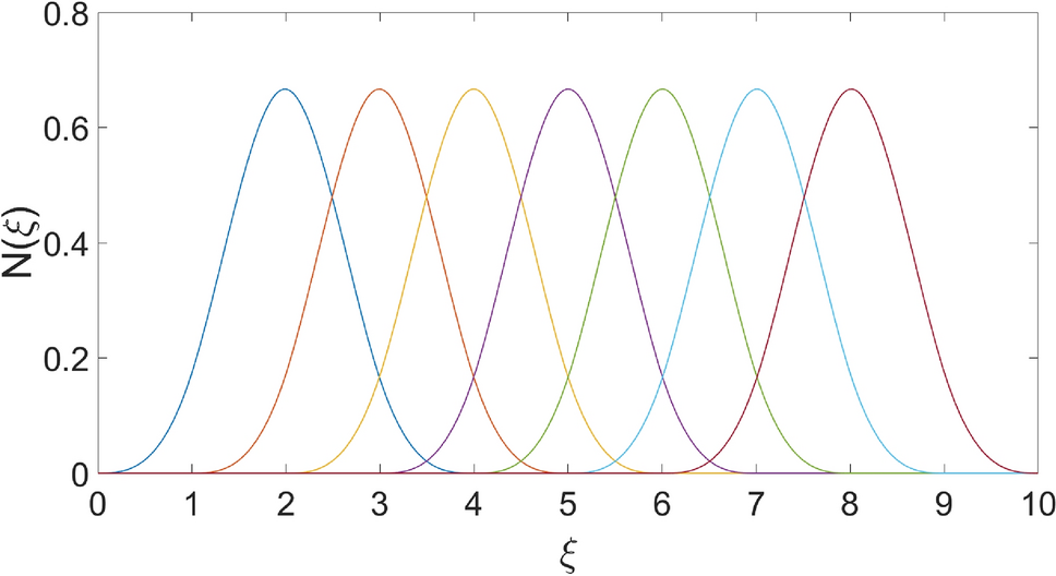 To illustrate this definition, an example for a 3rd degree function is developed. Consider a single patch in 1-D, which could be considered, for instance, as a model for a 1-D bar. Now subdivide (mesh) this patch by introducing a knot vector \(\varXi\). For the purpose of illustration, let us represent, a third degree function. To choose the number of required knots, we will also arbitrarily choose to generate 7 basis functions, leading to requiring \(p+n+1=11\) knots in the knot vector. Here we see that the knots act as subdivision (or meshing) of the patch, with the caveat that the degree of the polynomial under consideration imposes a constraint on the minimum number of knots required. As a first choice, let us assume \(\varXi =[0,1,2,3,4,5,6,7,8,9,10 ]\). The result of applying the previously outlined recursive definition leads to the functions seen in Fig. 3.
