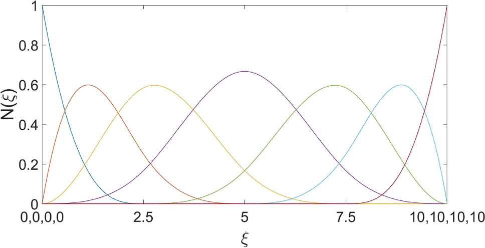 While these functions are \(C^2\) continuous at all points of the domain, they are not suitable for analysis as they all vanish on the boundaries, precluding non-zero values for all linear combinations of the basis functions on said boundaries. To eliminate this limitation, we illustrate the effect of knot repetition. By repeating the first knot \(p+1\) times the functions with support in that knot will change in value and continuity. If you consider these functions as belonging to the infinite parameter space and being compactly supported on the span of the knot vector, the first function with support on this node becomes discontinuous (also referred to as \(C^{-1}\) continuous on the literature), as shown in Fig. 4. The second function with support on that knot becomes \(C^{0}\) continuous, the third one becomes \(C^{1}\) continuous and so on. The same applies for the last node, which will also be repeated \(p+1\) times. As stated before, the rest of the knots must be equally spaced in order to generate suitable functions, which leads to the new knot vector being \(\varXi =[0,0,0,0,2.5,5,7.5,10,10,10,10 ]\). Referring again to Fig. 4, we see that regardless of the knot repetition, we are still generating 7 distinct functions of degree 3. Here we introduce a bit of terminology by calling the difference between two elements of the knot vector a “knot span”. Also, if a knot span has a non-zero value, its called a “non-trivial” knot span. In the same vein, the knot span between two repeated knots is called a “trivial” knot span.