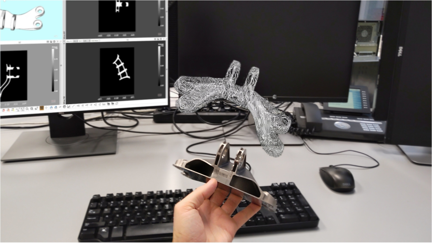 The AR HMD uses the stored shape to detect the material. The image of the sample captured by XCT is displayed alongside the physical sample and moves in sync with it. A traditional analysis can still be carried out via monitors in the background