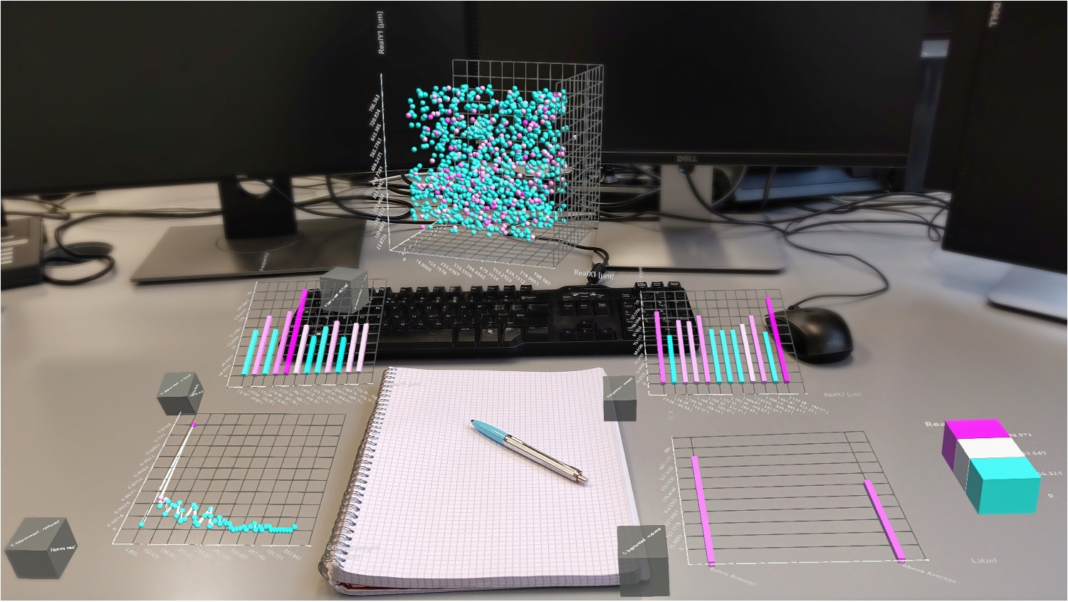 The framework offers various visualization techniques to analyze the secondary data, i.e., abstract data, in addition to the spatial data. These include histograms, 3D scatterplots, bar charts, and density plots. Figure 2 shows a collection of abstract visualization techniques arranged in an office setting. These charts may be created at arbitrary places in the world and are interactive during the analysis. Interactions with the virtual representations are again carried out using hand gestures through grabbing a handle in the form of a cube placed at the lower left side of each representation. The gestures applied to the handle allow for zooming, rotating, or similar interactions using a single or both hands. Visualizations may be generated for all attributes present in the secondary dataset. The histogram visualization displays the frequency distribution of a selected attribute, allowing for a quick understanding of the most common value ranges. The 3D scatterplot reveals correlations between three attributes and provides a deeper understanding of multi-dimensional relationships. The bar chart allows experts to compare various abstract data, enhancing their understanding of differences or similarities. The distribution plot provides experts with an analysis of the shape of the distribution of an attribute for understanding the variability, central tendency, and the presence of potential outliers in the data. The visual representations provide users with a quick overview of the material’s characteristics and structure, allowing them to conduct analysis in an immersive environment.