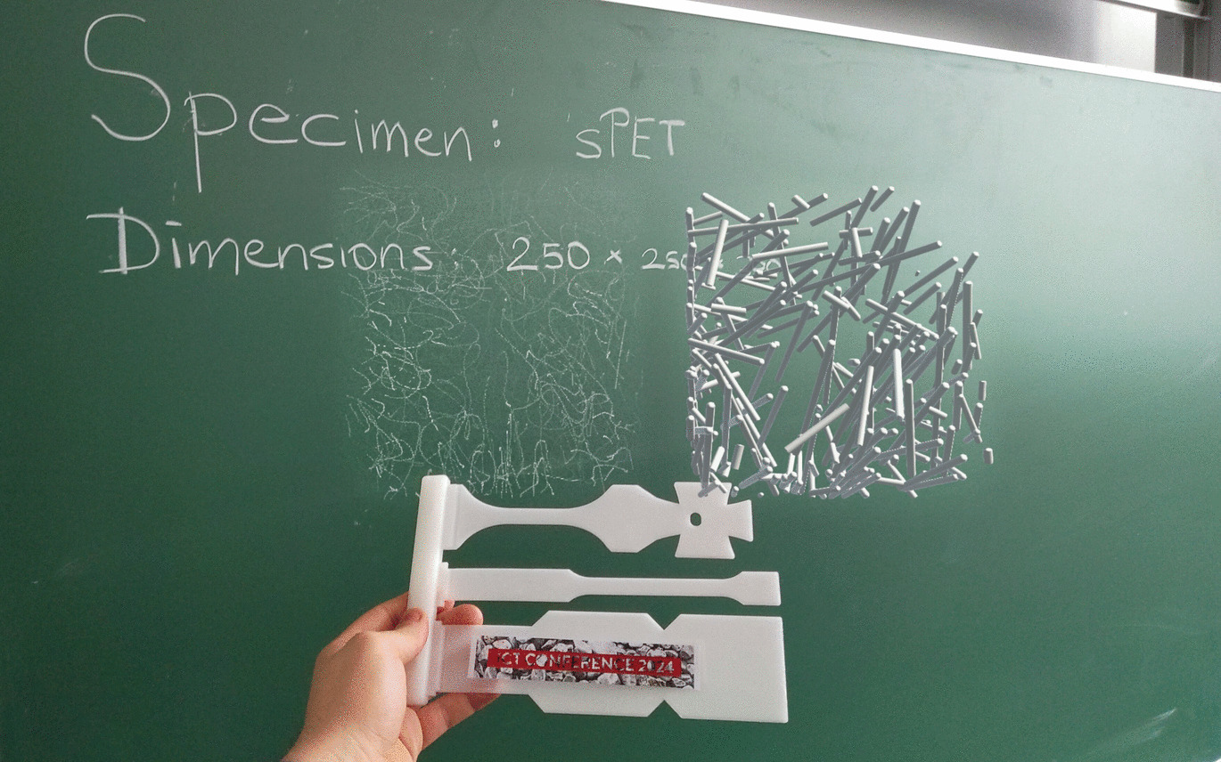 As use case for this evaluation we selected a material system with polyethylene terephthalate fibers in a polypropylene matrix material. The primary dataset of this material system was obtained from a respective CT scan and secondary data was subsequently derived by the experts through the fiber characterization pipeline outlined in Subsection 3.1. The investigated sample was cut out of a standard multi-purpose test specimen manufactured by injection molding. The CT dataset yielded a size of \(250 \times 250 \times 300\) voxels and contains 214 fibers, for each of which 20 distinct characteristics were computed. The validation of the data is not within the scope of our study. As the material is very thin and features a very homogeneous texture, two image targets were used for tracking. The image target on the front of the sample is visible in Fig. 3. As all study participants possess a background in analyzing fiber reinforced polymers, an exploration task was defined to ensure the expert’s workflow was in no way constrained. This enabled us to assess how the experts utilize our tool and identify any issues with it.