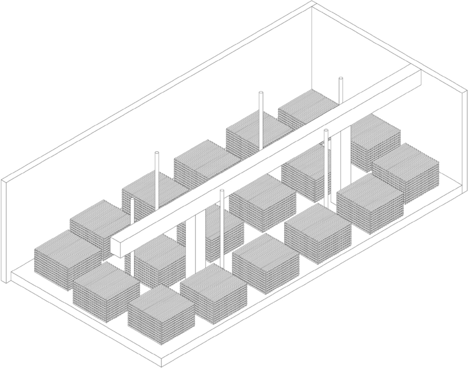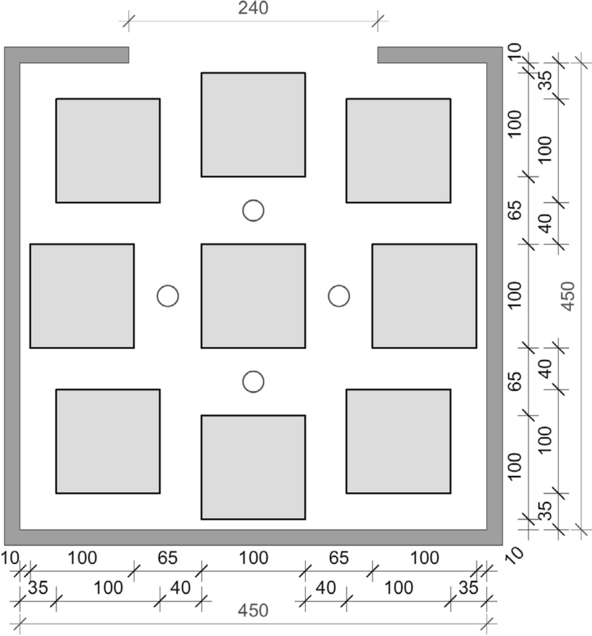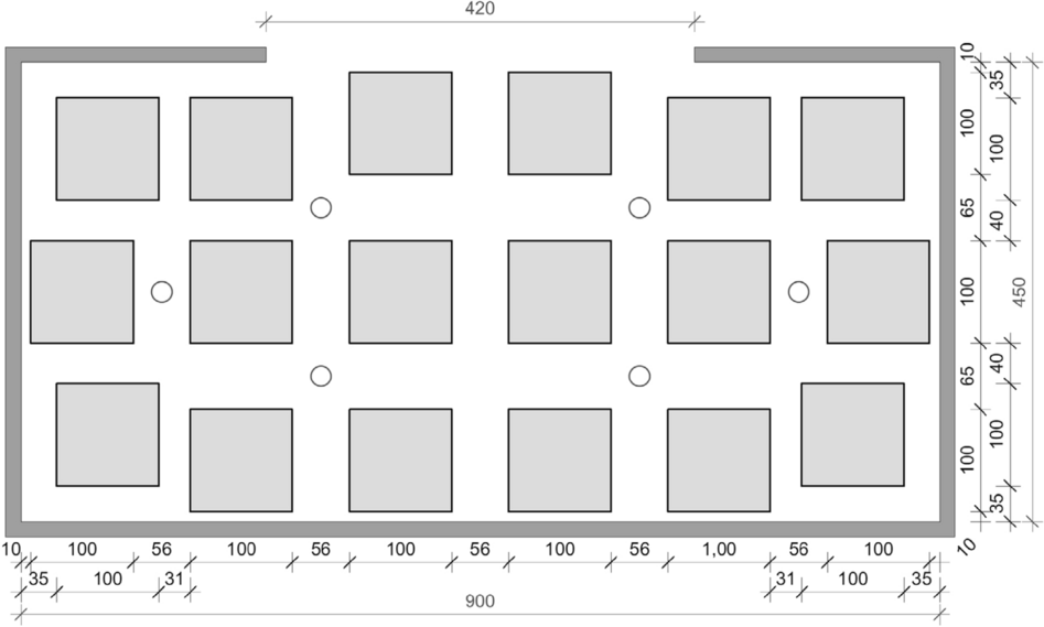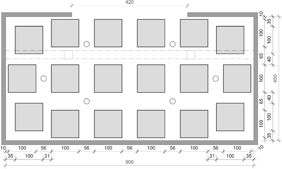 The fire load was designed in the form of wooden cribs. The floor area of the individual wooden cribs that are evenly distributed in the compartment is 1 × 1 m2 each. They are made of sticks of the dimensions W × H = 40 × 40 mm2. The surface to air ratio of the cribs is 1:1. Taking into account the wood moisture and the density of the wood, the fire load of 1085 MJ/m2 described above corresponds to approx. 74 kg/m2 of wood. In total, approx. 1.5 tons of wood were used in the small compartment (4.5 × 4.5 m2) and approx. 3 tons of wood in the large compartment (4.5 × 9 m2). The arrangement of the wooden cribs in the compartments are shown in Figs. 8, 9 and 11. Due to the very high fire load, the tests that were carried out can be defined as unique. This is also evident when comparing the fire load densities for Europe specified in Eurocode 1 or in the respective national annexes, as shown in Table 5 of Appendix.
