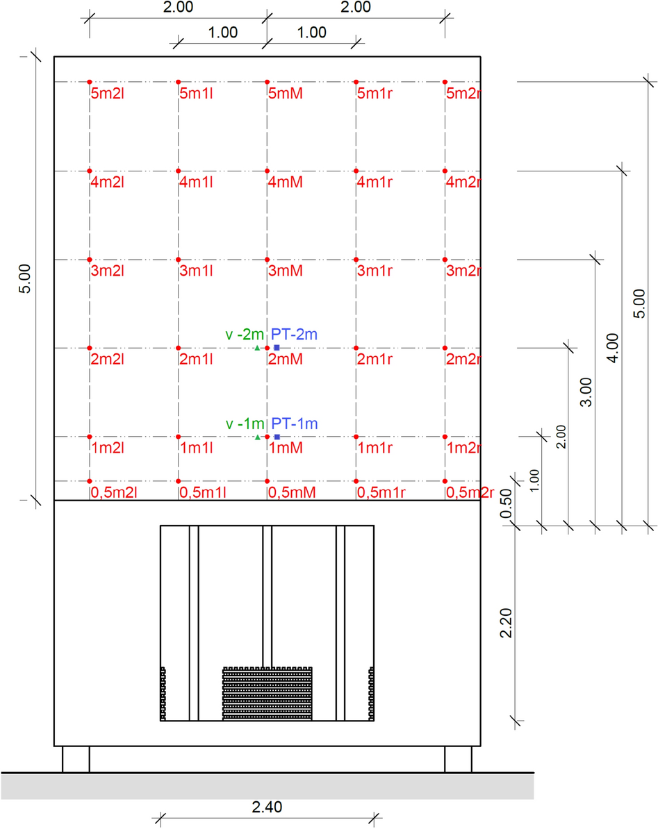 The thermocouples were positioned at a distance of 20 mm from the surface of the façade, the plate thermocouple and the bidirectional probes at a distance of 50 mm. They were fixed to a taut wire in front the façade. Figures 12 and 13 show the positions of the thermocouples.