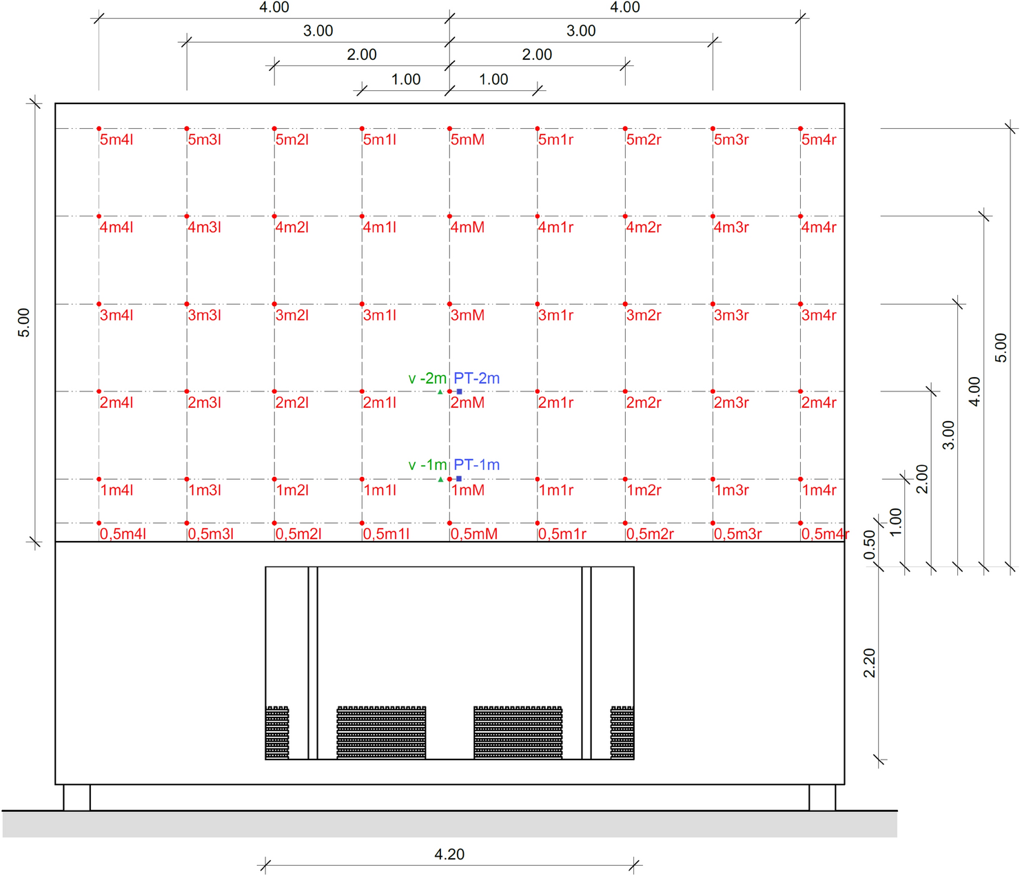 Façade shield V3 and V4 with dimensions and measuring points; unit of dimensions [m] (red ● = sheathed thermocouples, blue ■ = plate thermocouple, green ▲ = bidirectional probes) (Color figure online)