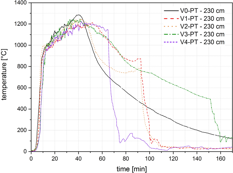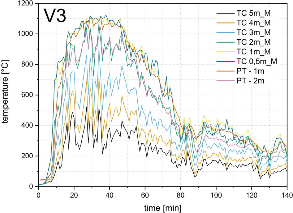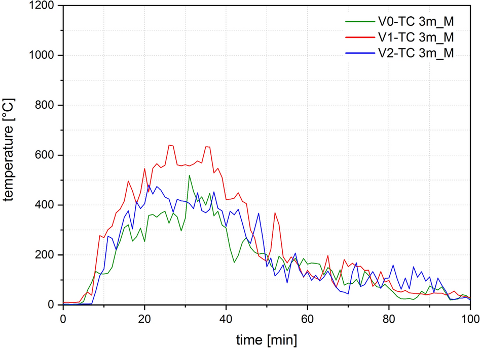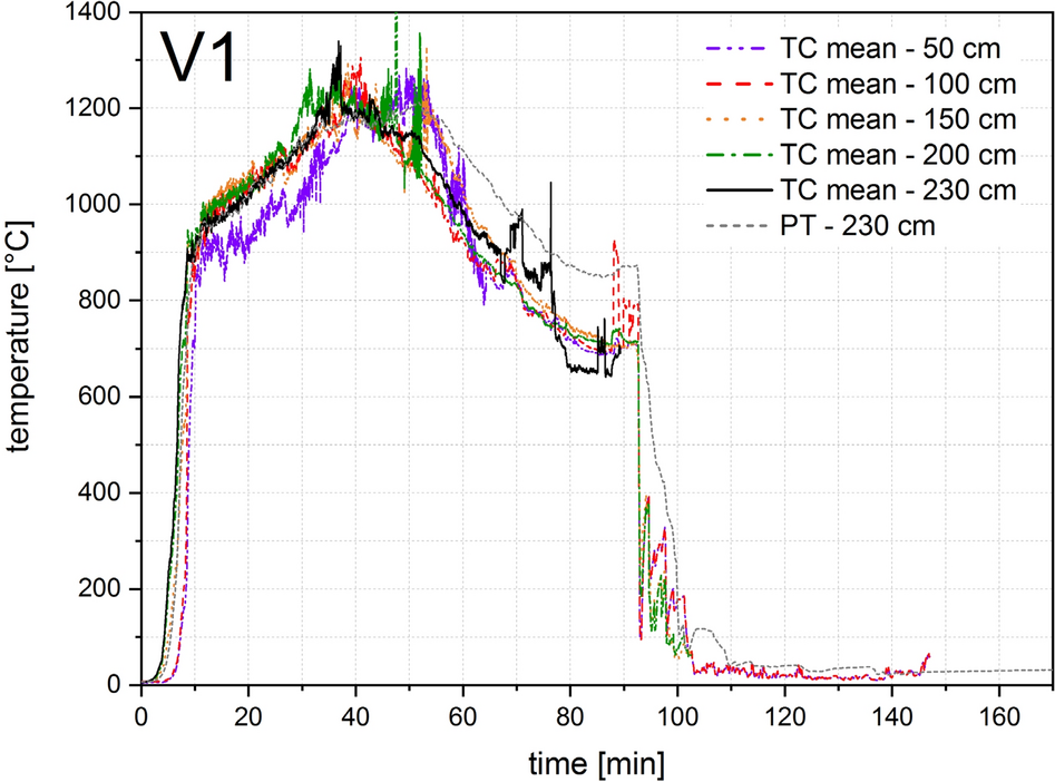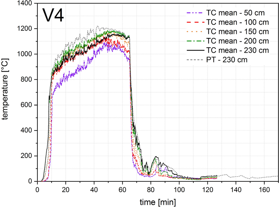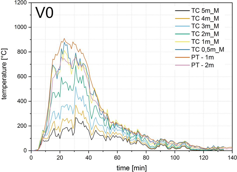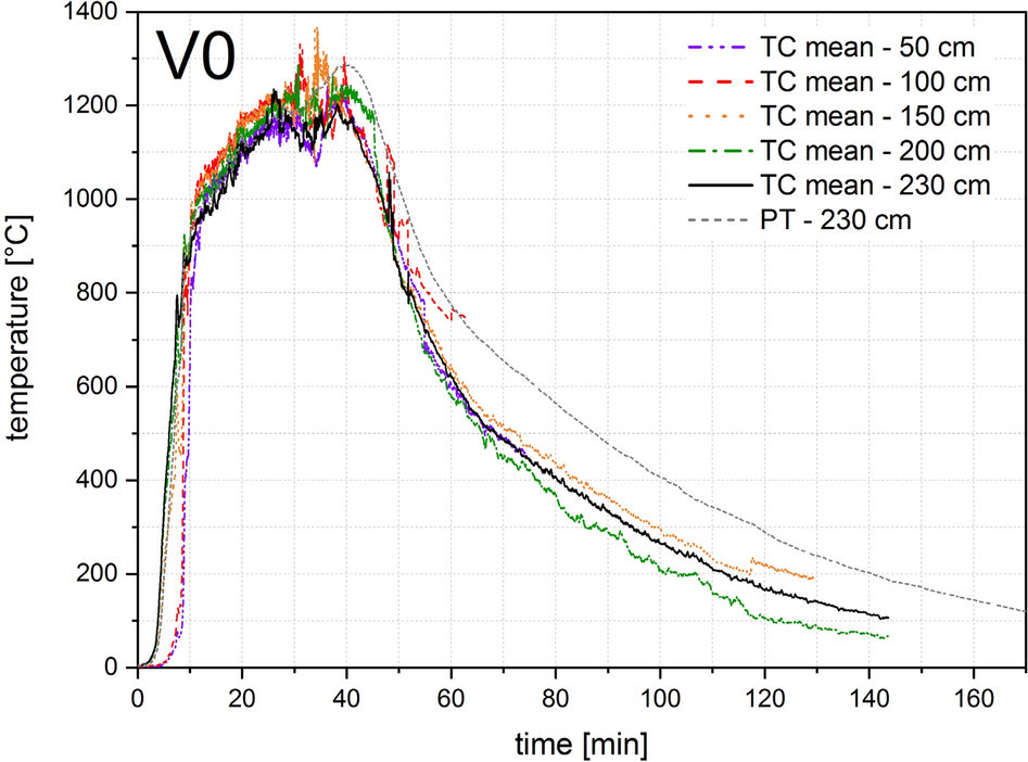 Four thermocouple trees each were arranged in the compartment test for V0, V1, V2 and six for V3 and V4, as shown in Figs. 8, 9 and 11. To measure the gas temperature, five thermocouples were arranged per thermocouple tree at heights of 50, 100, 150, 200 and 230 cm. Sheathed thermocouples of type K according to EN 60584-1 [32] with an outer diameter of 1 mm were arranged for V0 and V1, and with an outer diameter of 3 mm for V2, V3, V4. A plate thermocouple was installed 10 cm below the ceiling in all tests. This corresponds to a height of 230 cm in relation to the compartment.