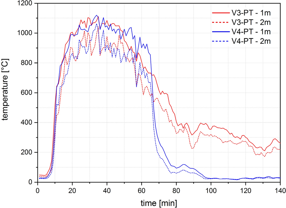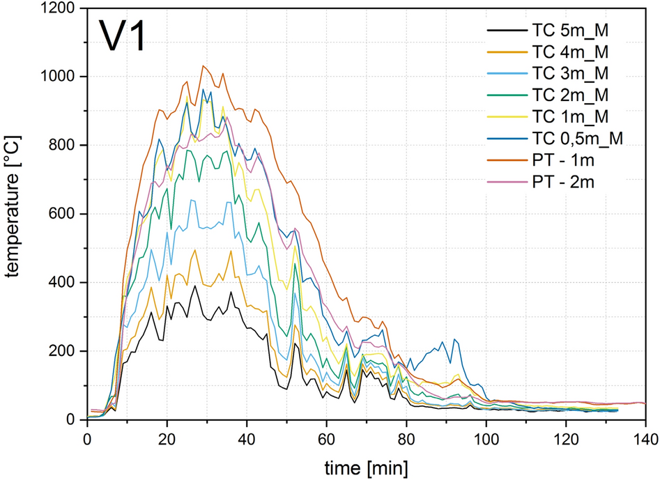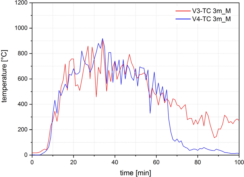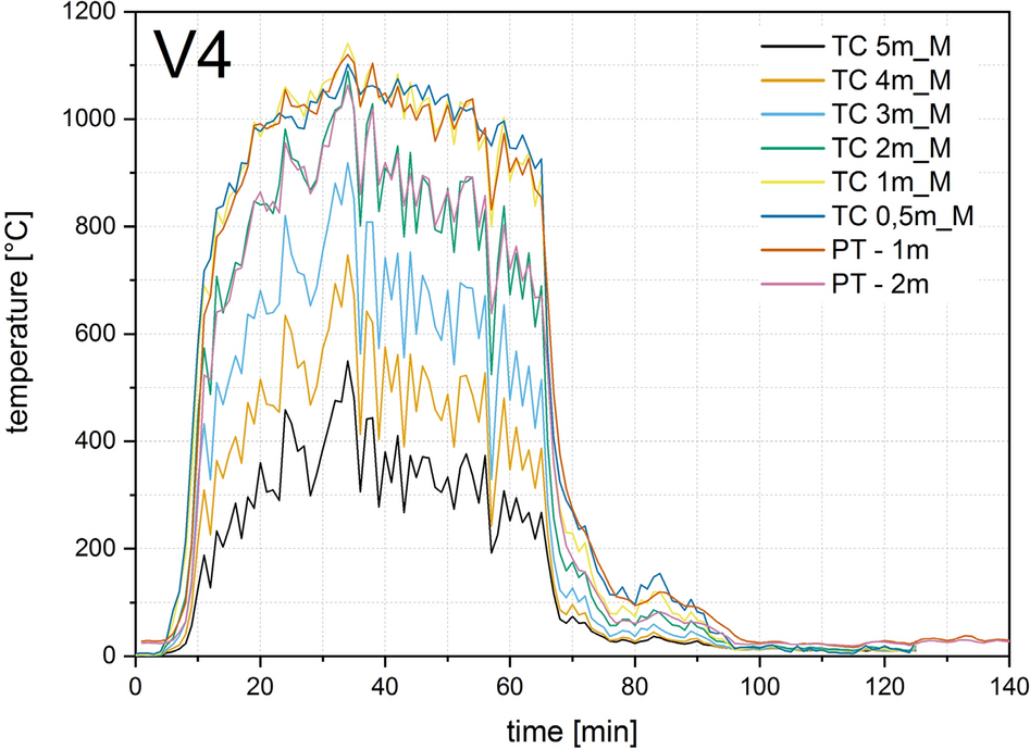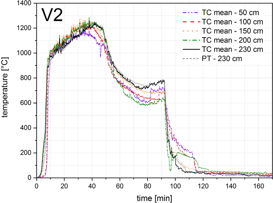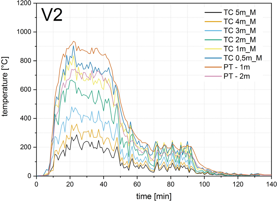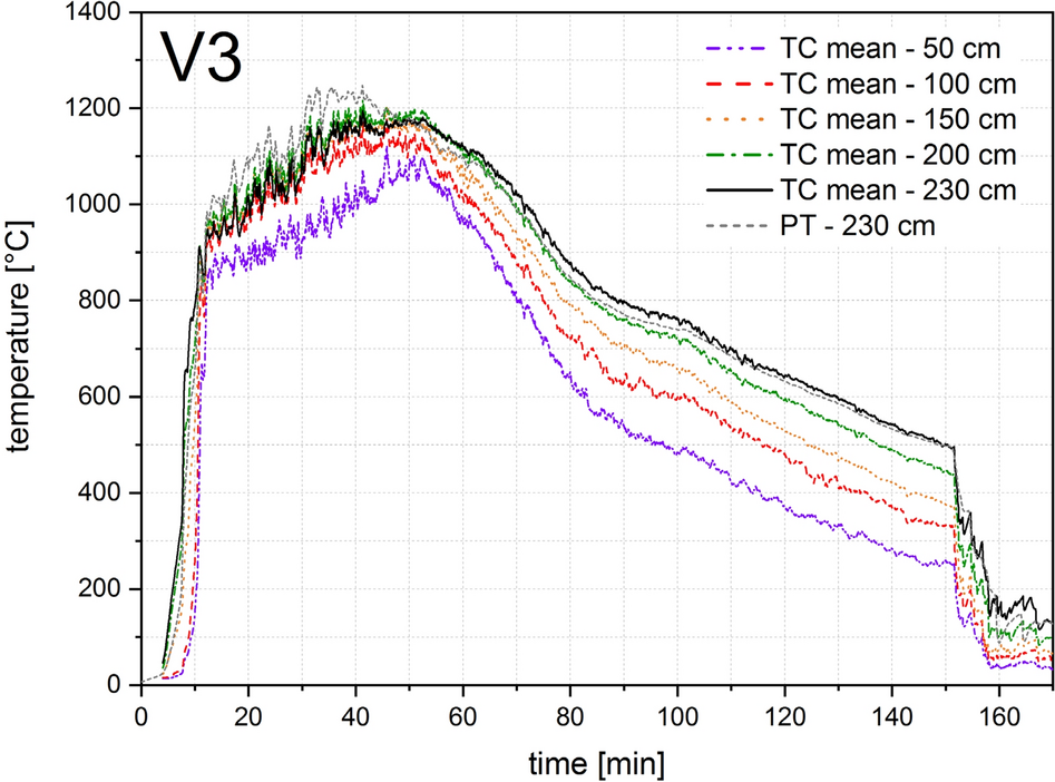 Four thermocouple trees each were arranged in the compartment test for V0, V1, V2 and six for V3 and V4, as shown in Figs. 8, 9 and 11. To measure the gas temperature, five thermocouples were arranged per thermocouple tree at heights of 50, 100, 150, 200 and 230 cm. Sheathed thermocouples of type K according to EN 60584-1 [32] with an outer diameter of 1 mm were arranged for V0 and V1, and with an outer diameter of 3 mm for V2, V3, V4. A plate thermocouple was installed 10 cm below the ceiling in all tests. This corresponds to a height of 230 cm in relation to the compartment.