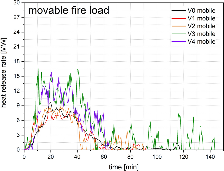 Comparison of heat release rates V0–V4 for the floor (movable fire load)