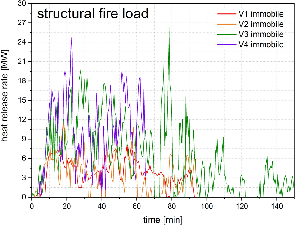 An existing strong oscillation can be seen despite the smoothing measures for the calculated HRRs of the floor (movable fire loads) in Fig. 19 and the structural components (structural fire load) in Fig. 20. Furthermore, it must be taken into account that the recorded data of the mass loss includes the dehydration loss as well as the falling off of lining parts. The HRRs shown, especially for the structural fire load, are therefore burdened with an unnamable imprecision.