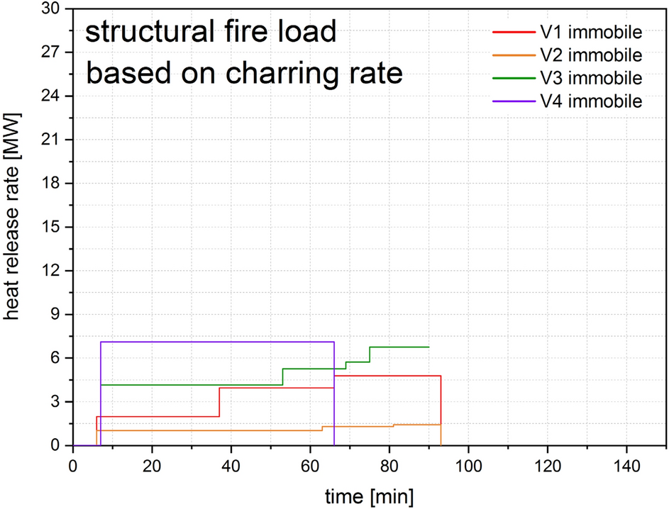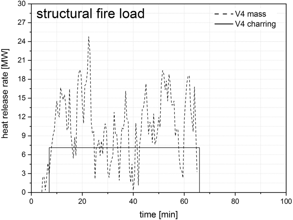 Comparison of heat release rates V0–V4 for the structural fire load derived from measured char depth at the end of the test