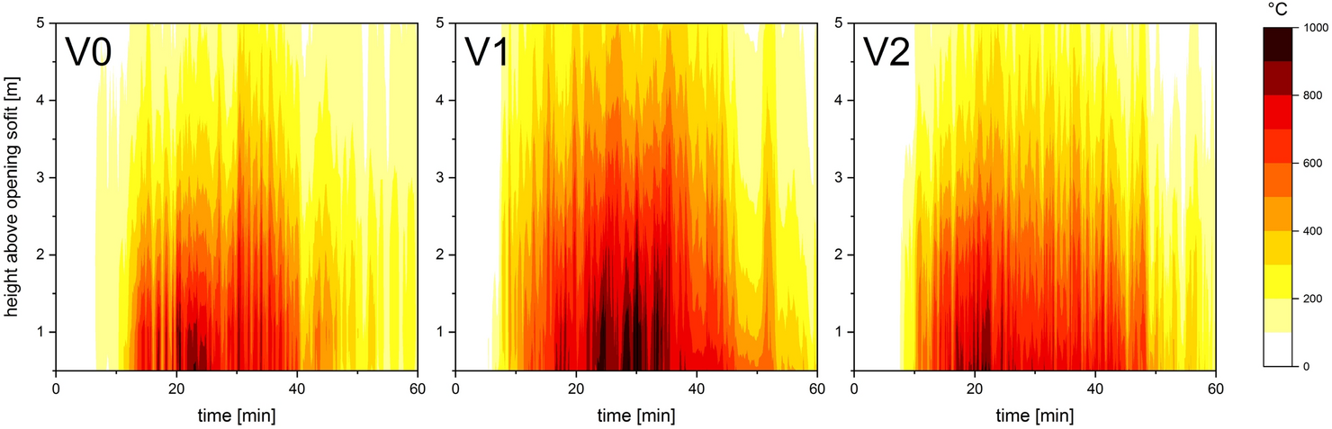 External gas temperature development throughout the first 60 min of V0, V1 and V2 for the measuring points located centrally above the opening at different heights