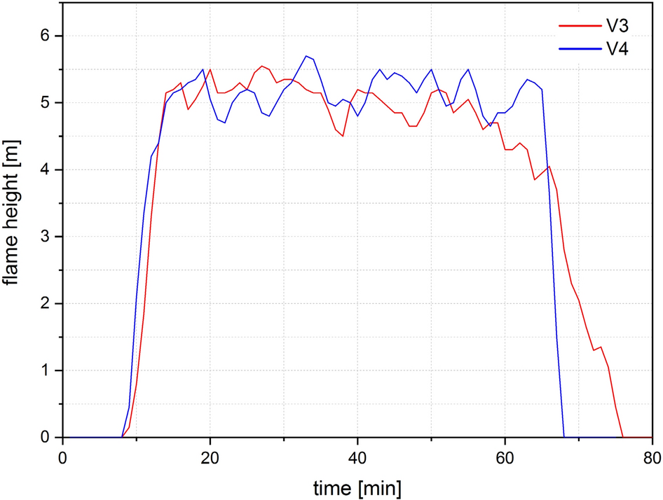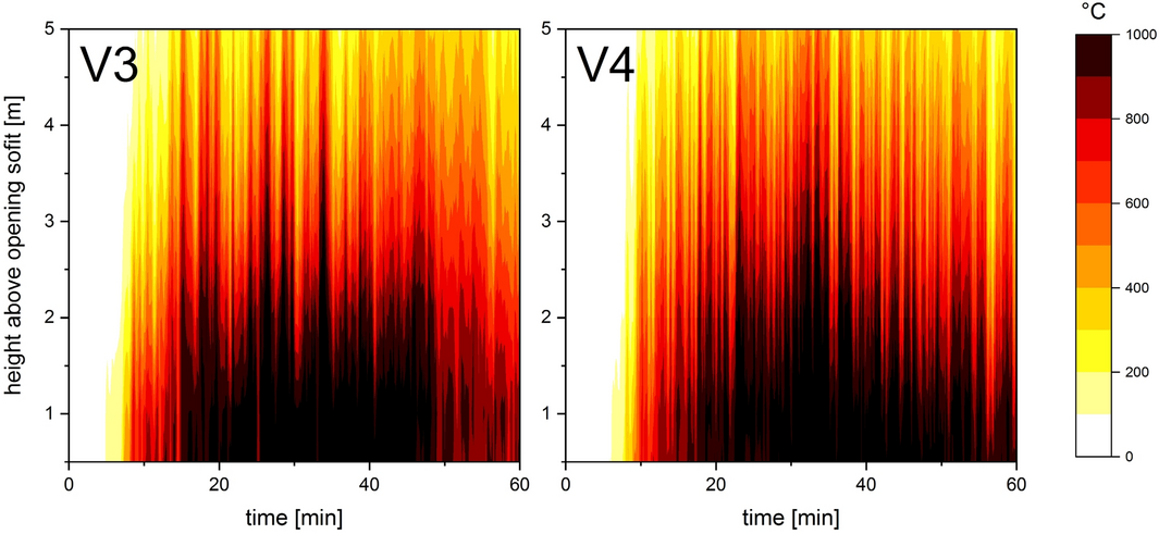External gas temperature development throughout the first 60 min of V3 and V4 for the measuring points located centrally above the opening at different heights