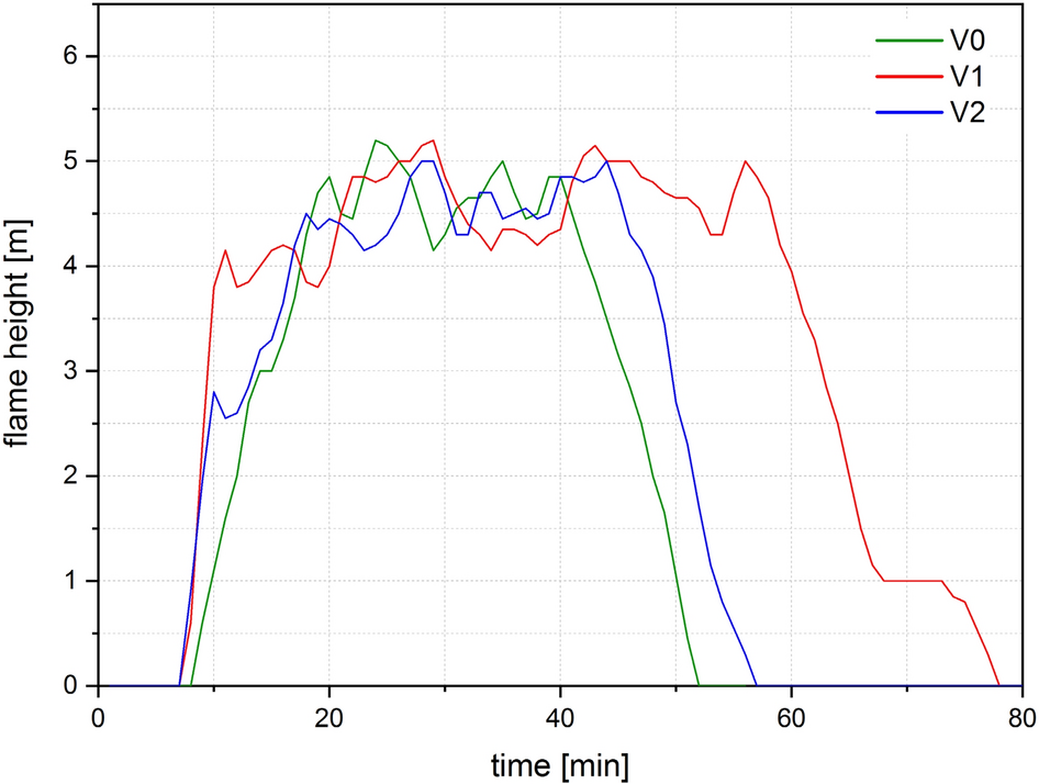 The internal dimension of the floor area was 4.5 × 4.5 m2 (LxW) for the first three compartment fire tests V0, V1, V2 and 4.5 × 9 m2 (LxW) for two following compartment fire tests V3, V4. The geometric ratio of the floor area of one to two made it possible to observe the spatial influence on the fire dynamics, as shown in Figs. 6, 7, 8, 9, 10 and 11. In order to represent typical room heights, the internal dimension of the test rooms is approx. 2.4 m, as shown in Table 1.