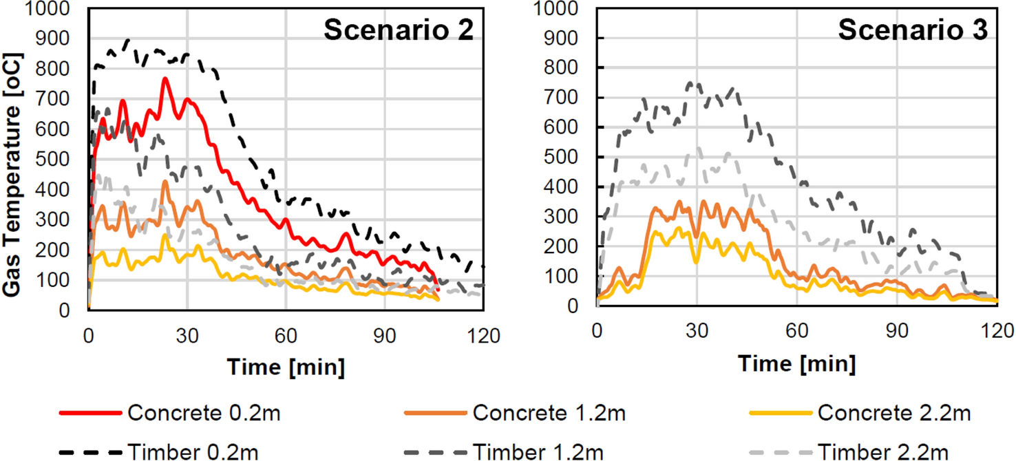 Gorska et al. [6, 7] investigated the effect of exposed timber walls and ceilings on the compartment fire dynamics in 24 medium-scale compartment (0.5 m × 0.5 m × 0.37 m with opening 0.3 m × 0.28 m) experiments. The compartments were constructed with cross-laminated timber (CLT). The contribution of the structural timber to heat-release-rates, the temperatures on the façade, the flame-heights outside the opening and velocity fields at the opening were investigated and compared to each other within the series of experiments. A significant increase in the magnitude of the external flames and of the temperatures at the façade due to exposed timber surfaces was observed. The data indicate that exposing more CLT surfaces to fire in the compartment results in larger external flames, and consequently in higher temperatures. However, the increase in temperature is not directly proportional to the area of CLT exposed to fire. In addition, a significant increase in velocities [7] and in radiant heat fluxes were detected as more CLT panels were left exposed. “The increase of radiant heat flux, especially at lower heights closer to the opening, presents up to five-time bigger values when compared to the baseline scenario. This change implies that the façade is exposed to five times more heat, which indicates that fire spread due to ignition of the façade materials is much more likely to happen” [6].