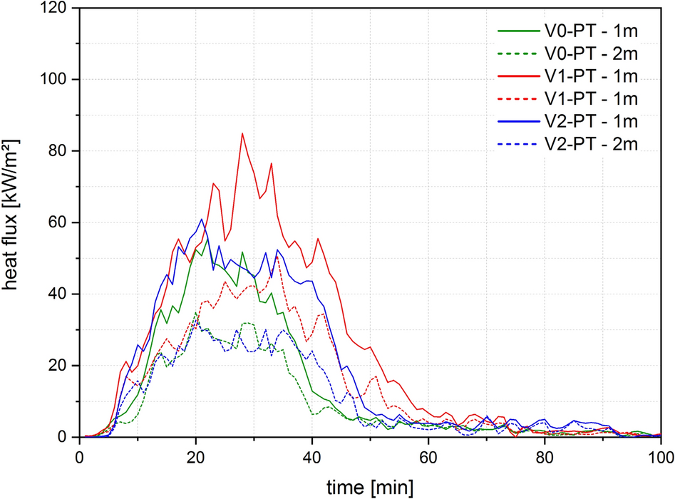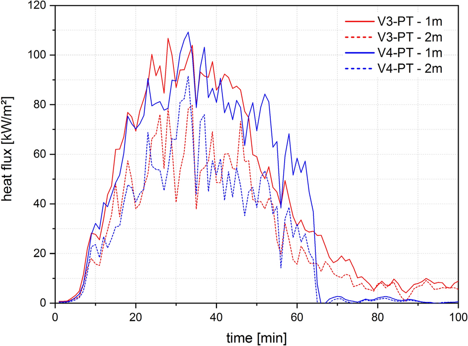 In Test 1 and 2, the heat flux showed an increasing trend until the fire was extinguished. Test 3 and 4 exhibited heat flux maxima approximately 20 min to 30 min after flashover, followed by a decrease of the heat flux when the movable fire load was consumed, as shown in Fig. 1.
