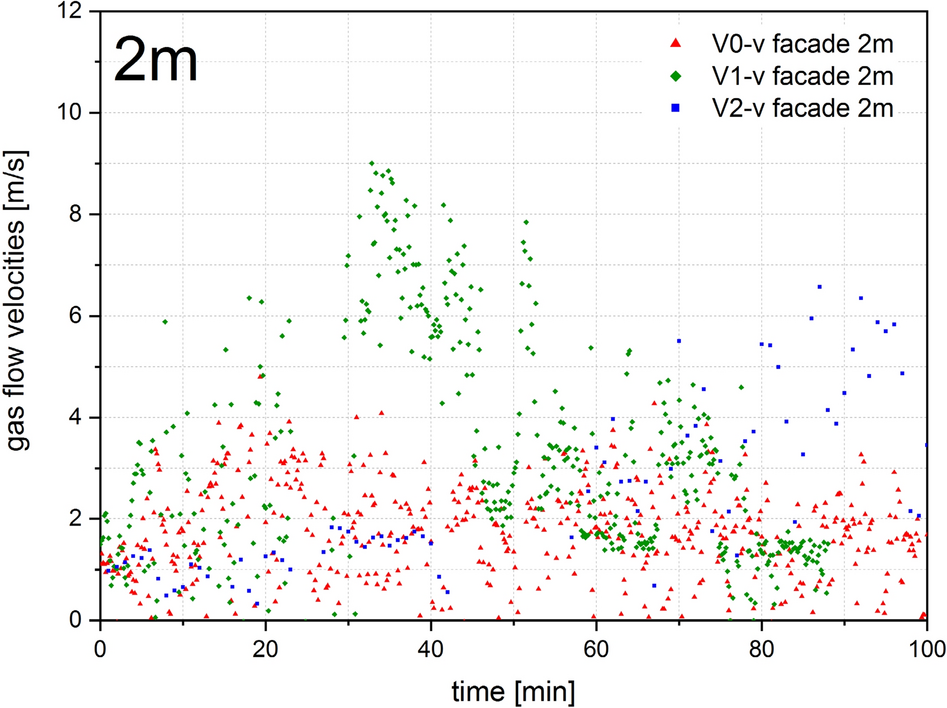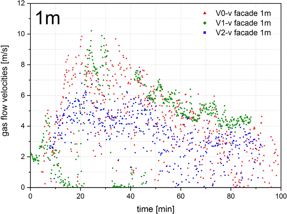 30 thermocouples, two plate thermocouple and two bidirectional probes for measuring the gas flow velocity were placed on the façade shield for V0–V2 and 54 thermocouples, two plate thermocouple and two bidirectional probes for V3 and V4. Sheathed thermocouples of type K according to EN 60584-1 [32] with an outer diameter of 3 mm, plate thermocouple according to EN 1363-1 [33] and bidirectional probes of the type BS11 according to [34] were used.