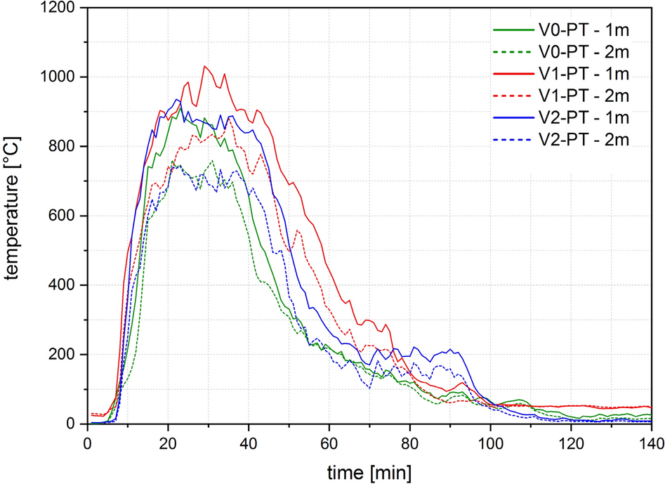 Figures 14, 15, 16, 17 and 18 show the gas temperatures in the compartment at different heights for each test. The measurements of the thermocouple (TC) trees are presented as an average value over the four trees (V0–V2) or the six trees (V3 and V4). In addition, the plate thermocouple (PT) on the ceiling is also shown.