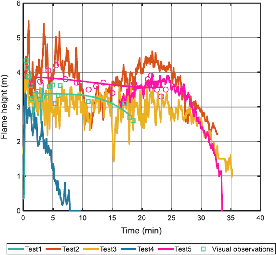 Flame heights determined by data obtained by image analysis or visual observations [25]