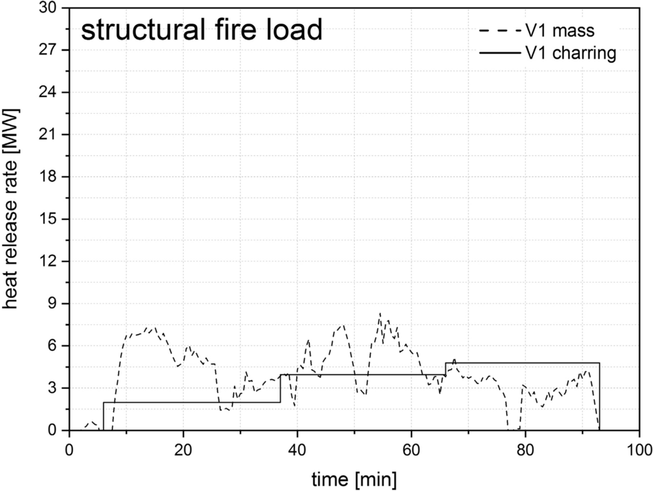 The HRR from the measurement data of the mass loss is calculated by determining the mass loss rate and assuming a calorific value of 17.28 MJ/kg, a wood moisture content of 14% and a combustion efficiency of 0.9. Due to the strongly fluctuating measurement data, a moving average was first formed over 9 measurement cycles (recording frequency 1 s). The measurement data were then used as 25 min average values to calculate the HRR, as shown in Figs. 19 and 20 [35].