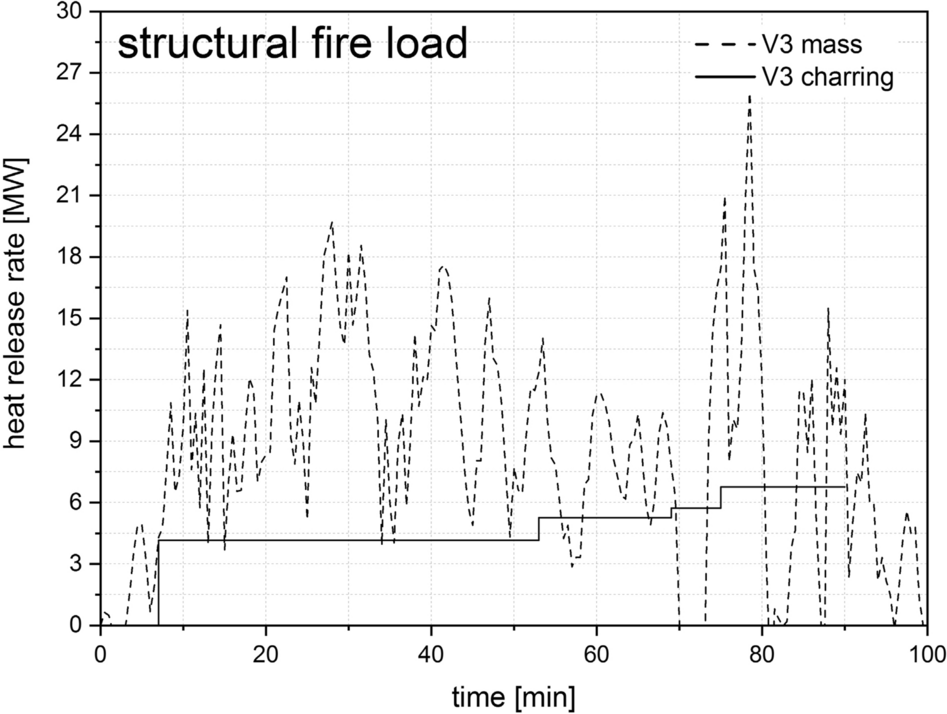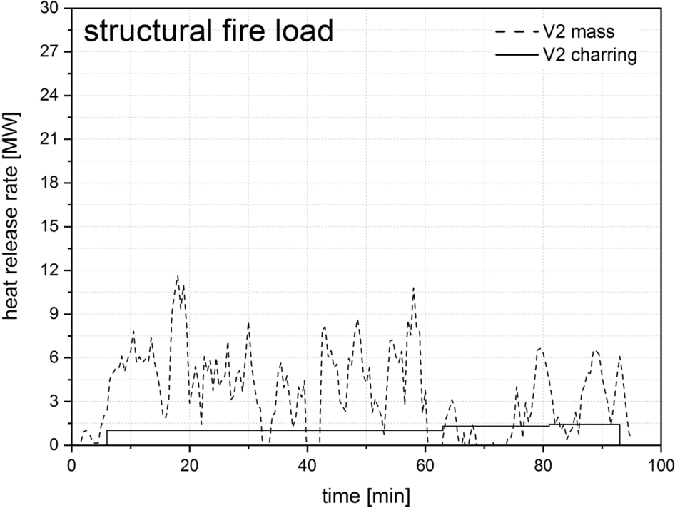 The HRR is calculated with the help of this information and the aforementioned specifications for calorific value, wood moisture and combustion efficiency, in connection with an assumed density of wood of 450 kg/m3, as shown in Fig. 21. It should be noted that the calculation is based on the same assumptions for solid timber, light timber frame components and OSBs. Charring is assumed to be constant over time. In the case of V3, calculations are only made up to the 90th minute, as there is no constant charring at this point because there is no longer a movable fire load. These assumptions also lead to uncertain results. However, they should provide a trend and enable comparability. For a better comparison of the two approaches to determining the HRR (mass loss vs. charring rate), the results are compared directly to each other in Figs. 4, 41, 42 and 43 of Appendix. It can be stated that the results have a similar range of values.