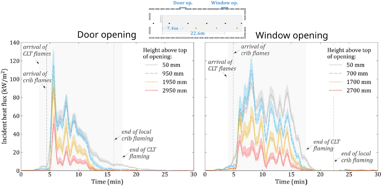 Kotsovinos et al. [26] investigated the fire dynamics of large compartments. The test CodeRed #01 was carried out inside a large open-plan compartment with a floor area of 352 m2. The compartment had a fully exposed CLT ceiling and GLT columns. Previously, the research team had already carried out two comparable tests in non-combustible compartments [27, 28]. In a first comparison, the research team concluded that the CLT ceiling impacts the total HRR substantially, nearly doubling the peak HRR from 69 MW [27] and 58 MW [28] to 121 MW [26]. This extra HRR impacts the amount of external flaming. External flames were observed 6 min after ignition of roughly 2.5 to 3 m in height. An initial visual comparison showed an increase in flame lengths due to the presence of exposed timber surfaces. Figure 4 shows the heat flux on the façade for the door and window opening [26].