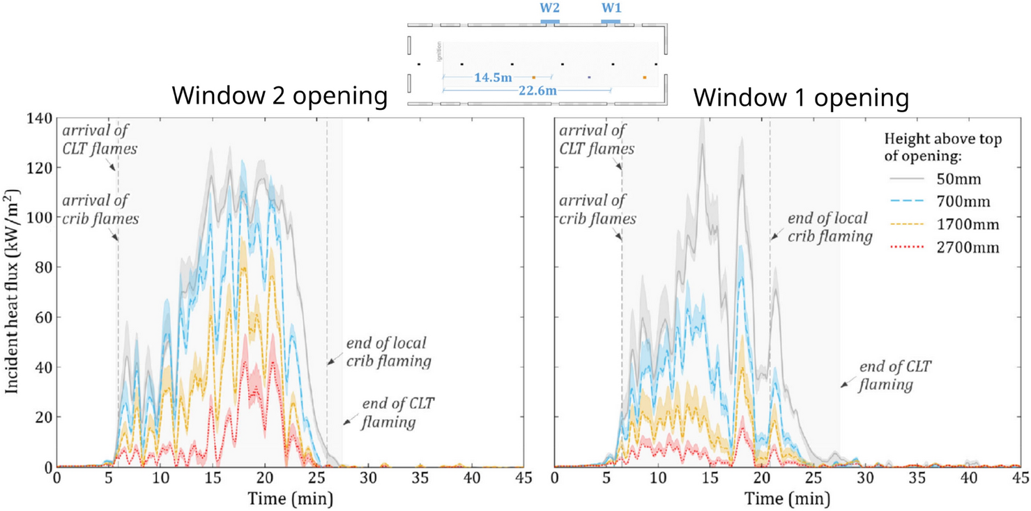 Su and Lougheed [13] conducted four full-scale fire tests with two compartments made of light timber frames, one made of lightweight steel-frames and one made of CLT. As part of these tests, they measured the heat flux on the façade 3.5 m above the compartment openings. The measurements concluded that the involvement of the timber joists and OSB linings in the fire led to the increase of the heat release rate (HRR) and heat fluxes to the façade and adjacent structures [13].