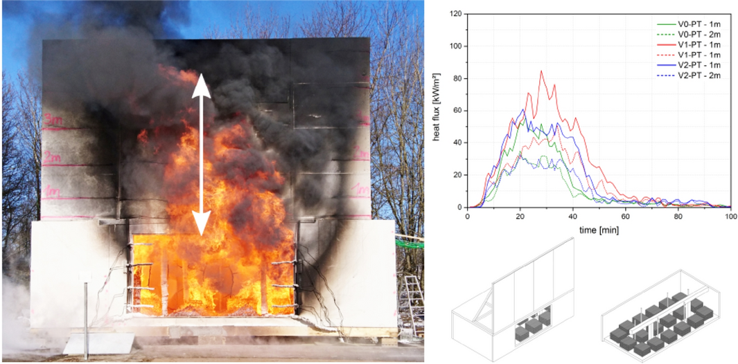 The experiments presented above show that exposed timber surfaces in the compartment lead to an increase in heat flux and flame height outside the opening. However, it should be noted that the experiments were all carried out on a reduced scale. An attempt was subsequently made to reproduce the full-scale fire tests presented in this study (Sect. 3) by experiments on a scale of 1/10. It turned out that the fire dynamics in the room, and especially on the façade, could not be reproduced appropriately [10].