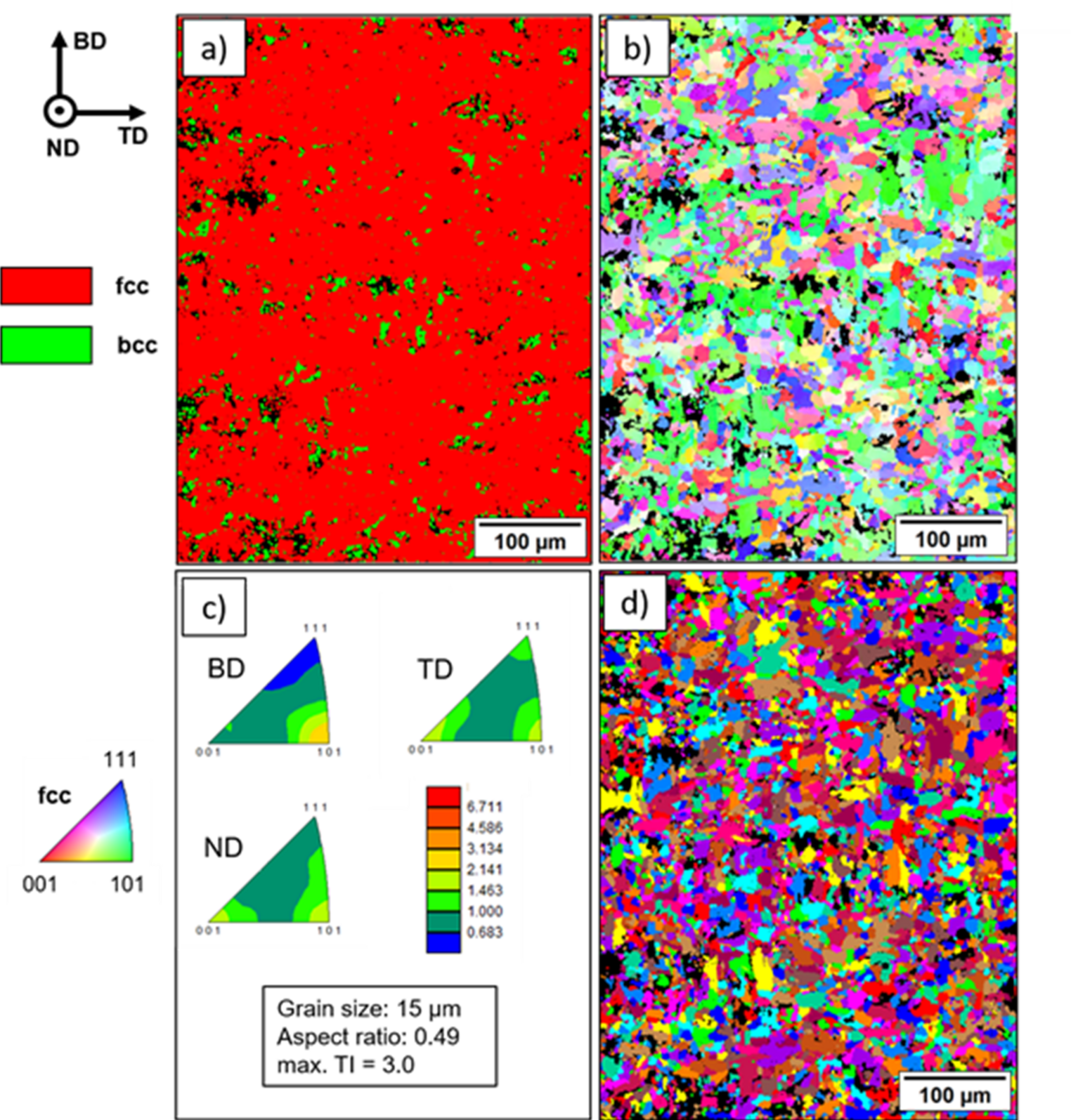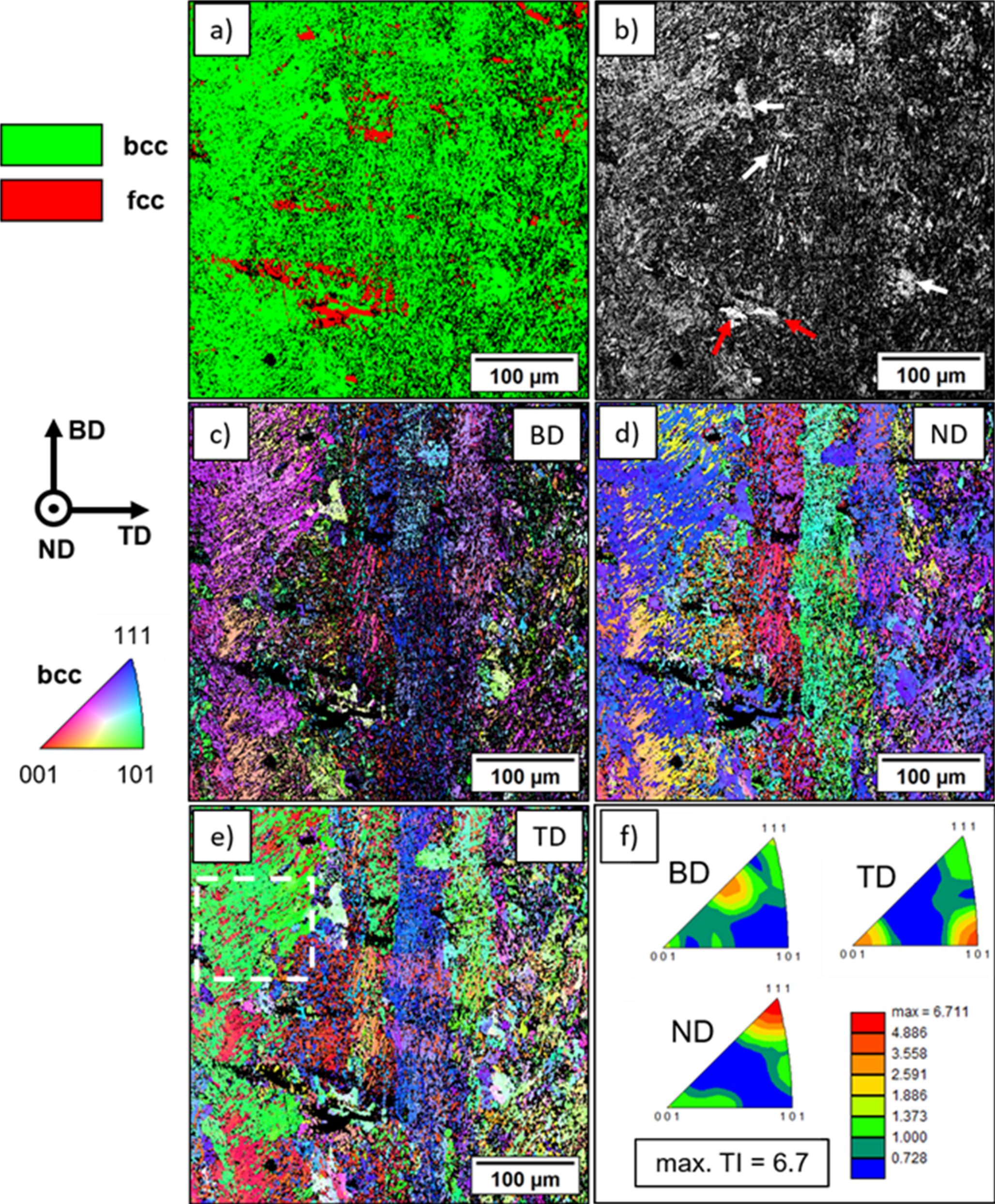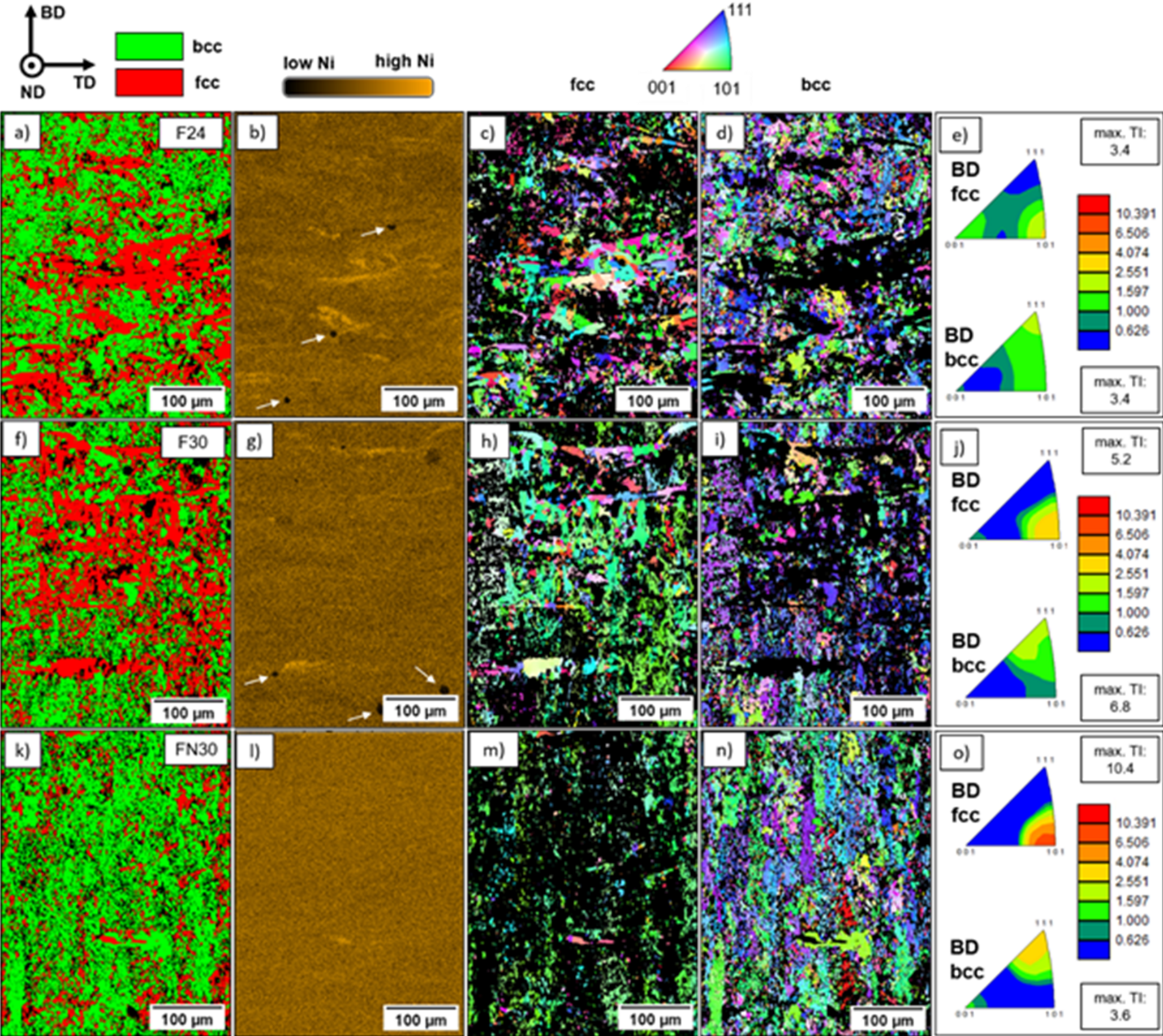 Besides the grain size and grain morphology, specimen C24 displayed a slight < 011 > texture with a TI of 3.0 in the BD. In contrast, alloys processed in powder bed AM processes often show a pronounced < 001 > texture in BD [51], which was also observed for the austenitic steels AISI 316L [52‐55] and AISI 304L [19]. Furthermore, the steel X2CrMnNi16-7–9 also displayed a very pronounced < 001 > texture and columnar grain growth in the BD with a TI of up to 14.5 [12]. The similar steel X5CrMnNi16-6–6, however, showed very weak texture indices with values of less than 2.0 [2‐4, 8, 9]. Nonetheless, the presence of a < 011 > texture in the BD, as observed for X2CrMnNi16-7–4.5, is not uncommon in powder bed AM processes and has been reported in literature for various alloys [56‐59]. However, the precise mechanism leading to this specific texture is currently under investigation, since the X2CrMnNi16-7–3 has not been processed in PBF-EB/M so far. Furthermore, a shift in crystallographic texture for specimen C30 from fcc < 011 > towards the bcc < 111 > direction can be observed. As previously explained, this is only a martensitic phase transformation at the surface of the specimens, which was caused by the metallographic preparation, although grinding was done with hot water.