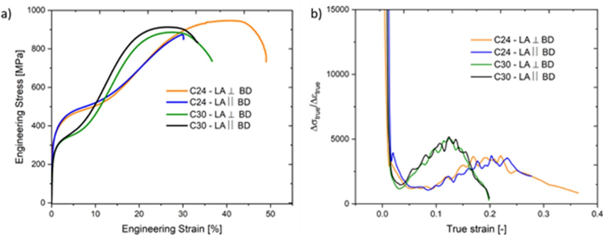 After passing the \(YS\), the material exhibited a certain amount of strain hardening followed by the start of martensitic phase transformation at the inflection point of the engineering stress–strain curve, correlated to the TRIP effect. However, the strain hardening rate observed in the 30 J/mm3 tensile specimens was higher than in the 24 J/mm3 specimens (see Fig. 11b). As previously stated, this phenomenon can be explained by the more pronounced manganese evaporation in combination with columnar grain growth. These factors led to a decrease in austenite stability and, therefore, a higher tendency for the martensitic phase transformation under loading. The lower austenite stability is also displayed by the increasing values for \({M}_{\text{s}}\) and \({M}_{\text{d}30}\), resulting in a significant increase in the hardening rate of C30 with lower Mn content [14, 15].