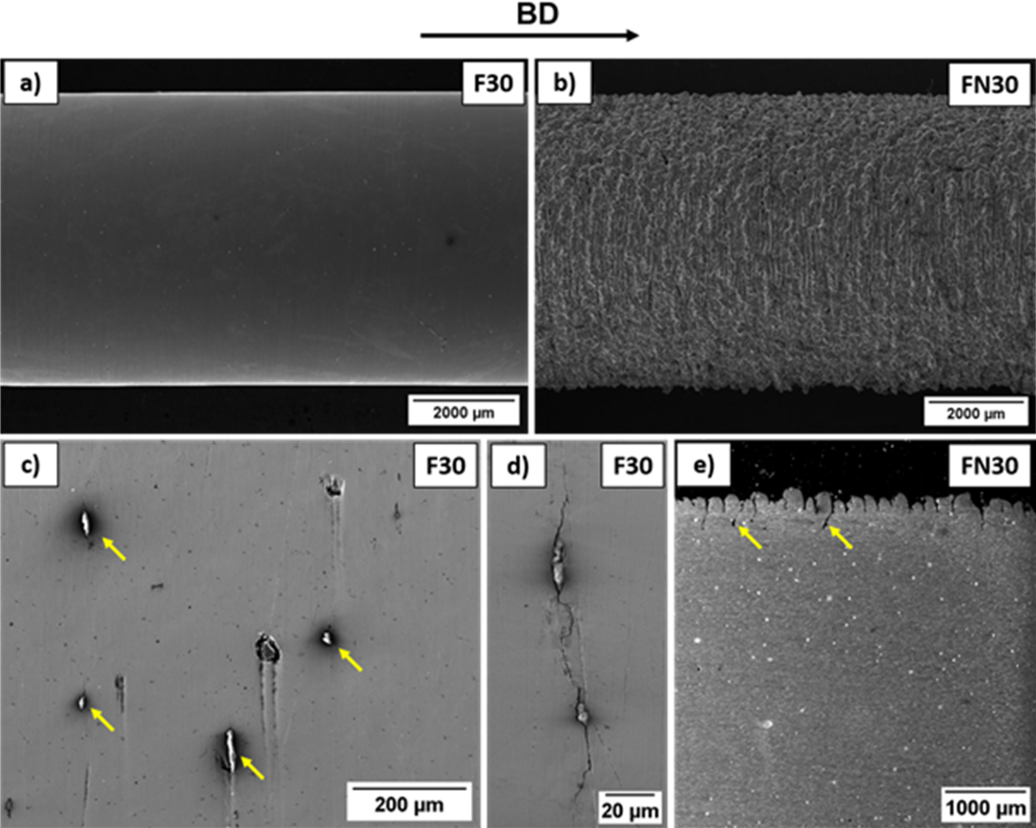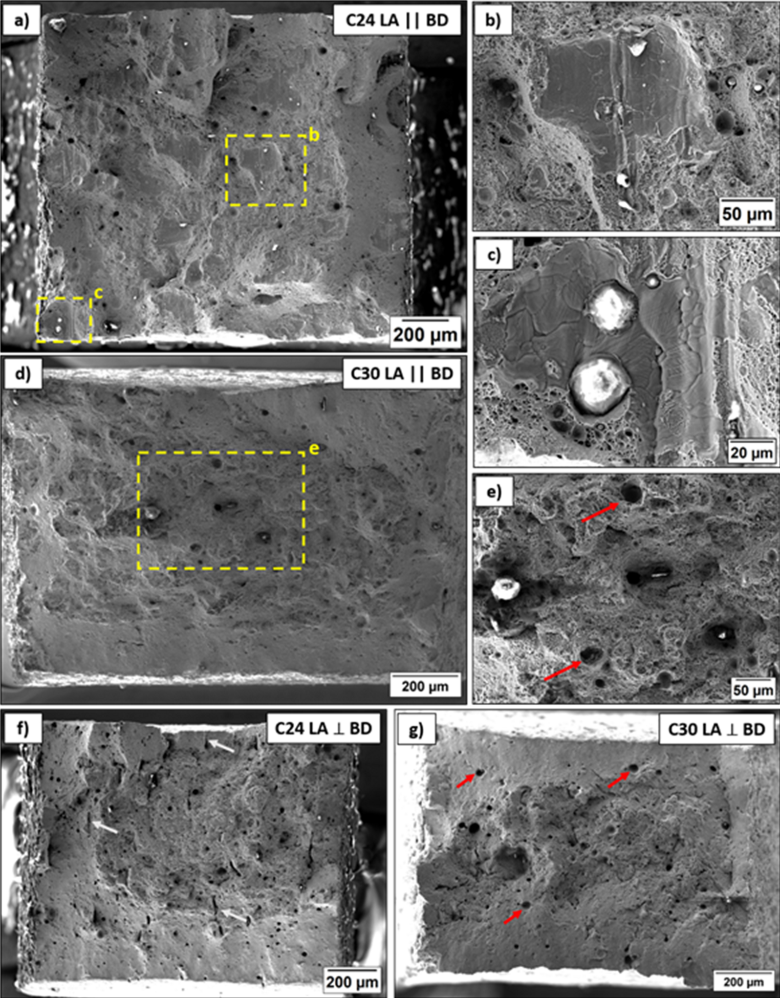 Due to the lower austenite stability of C30, a higher \(\alpha {\prime}\)-martensite content was achieved at the same strain values compared to C24. In the case BD ⊥ LA, the elongation to fracture of C30 was reduced in comparison to C24, since a significant portion of the martensite forming capability in C30 has already been depleted at lower strain levels (see Fig. 11). In contrast, C24 still exhibited the potential for \(\gamma\) → \(\alpha {\prime}\) phase transformation under loading at higher strains, due to the higher austenite stability. Generally, for specimens with BD ⊥ LA, higher \(UTS\) and elongation to fracture were observed. Although the strain hardening behavior in the case BD || LA of both batches C24 and C30 remained similar to the BD ⊥ LA condition, they showed a decrease in elongation to fracture. Especially C24 with BD || LA exhibited premature failure without reaching the maximum strength potential, leading to fracture without any necking, as illustrated in Fig. 12a. This particular fracture surface showed a high number of NMIs and LOF defects in their vicinity. However, such a defect density was not observed for the C30 specimen in Fig. 12d. It is, therefore, assumed that the higher energy input in specimen C30 also melted areas in the vicinity of NMIs more sufficiently. It is known that such NMIs can lead to defects during AM [63] since they generally act as a heat shield in powder bed additive manufacturing, as reported in [64]. In electron beam processes, NMIs can additionally accumulate charge due to their low electrical conductivity, potentially leading to electron beam deflection and improper melting of the surrounding material [64‐66]. The positive effect of an increased energy input seems reasonable, since it is well established that the width and depth of a melt pool increase in proportion to the energy input [67], resulting in enhanced density and mechanical properties to a certain extent. As a consequence of proper melting, the amount of NMI-induced LOF areas, which act as an easy crack nucleation and a fast path for crack propagation, diminish. Consequently, the mechanical properties for both BD ⊥ LA and BD ‖ LA specimens converge for C30 (see Fig. 11a). In conclusion, the high number of NMIs can only be attributed to the initial powders. Since the X2CrMnNi16-7–9 powder was already thoroughly investigated [2, 12] and NMIs of such quantity were never observed, the impurities must originate from the X2CrMnNi16-7–3 powder. In addition, the powder was not further processed after atomization. Therefore, the impurities must originate from the raw material. Most likely these NMIs were introduced during the casting of the electrodes for the EIGA process.