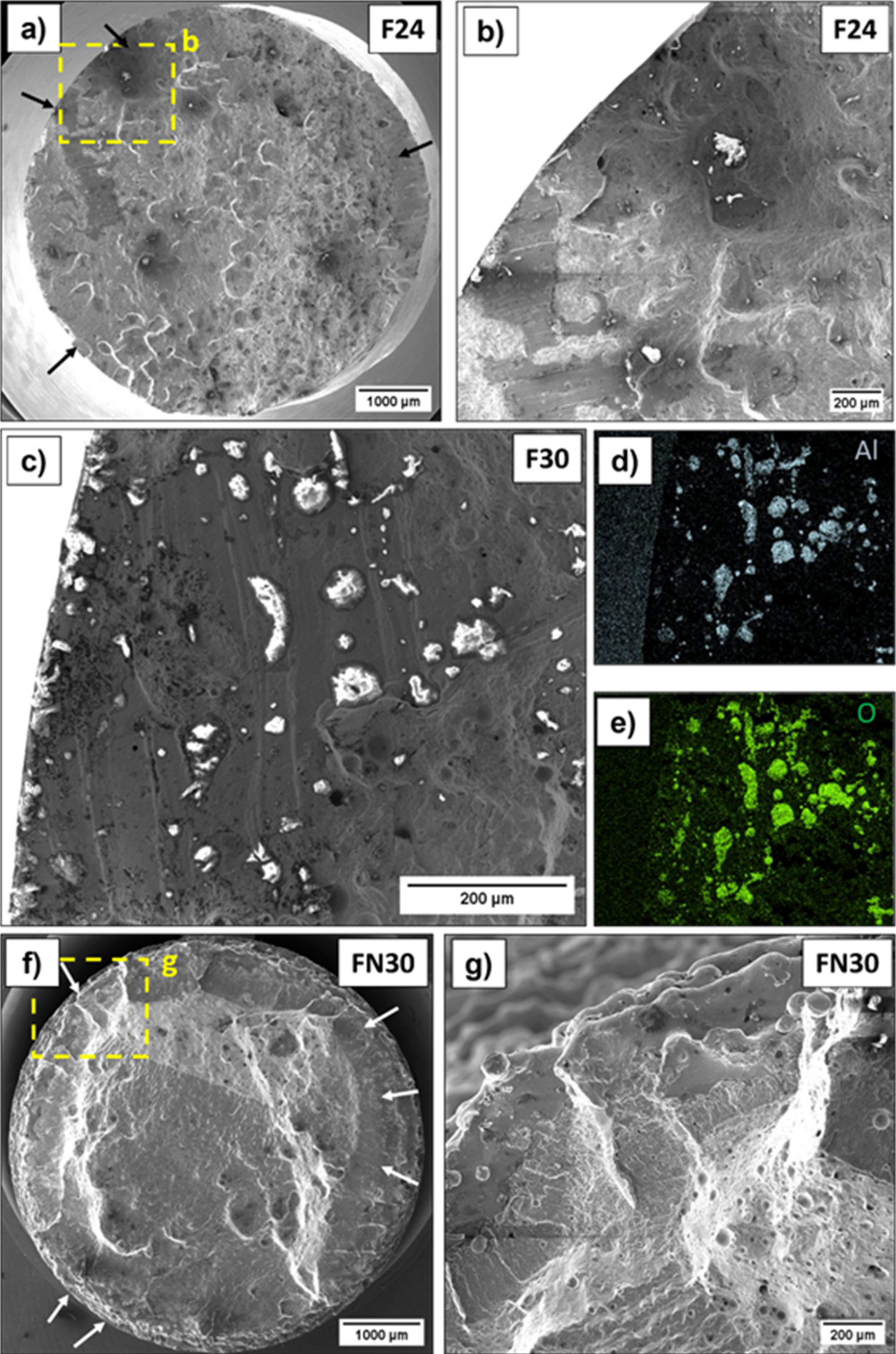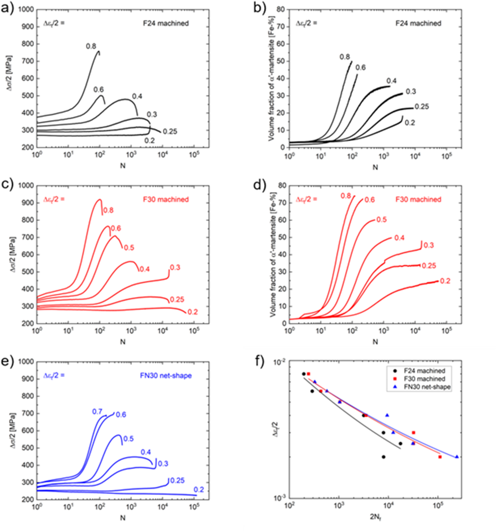 For fatigue specimens manufactured with a lower energy input of 24 J/mm3 (F24), the fine-grained microstructure, combined with a significantly higher yield strength, had no positive effect on the fatigue life due to the extensive presence of NMIs and LOF defects. Due to the small average grain size, specimen batches F24 and F30 exhibited higher initial stress amplitudes than the FN30 condition with larger, columnar grains. An increase in energy input to 30 J/mm3 (F30 and FN30) led to an improved melting for fatigue specimens, resulting in a longer fatigue life. This agrees with the improved \(UTS\) and elongation to fracture for tensile specimens with a loading direction parallel to the BD and built with an increased \({E}_{\text{vol}}\) of 30 J/mm3. In analogy to the tensile tests, it was observed that the F30 batch showed a higher tendency for martensite formation in comparison to the F24 specimens. This can be explained due to the lower austenite stability in F30 as a result of higher manganese evaporation during PBF-EB/M. Surprisingly, surface machining did not show any improvement in the lifetime under cyclic loading for the 30 J/mm3 specimens. This can, however, be explained by the high number of large NMIs distributed throughout the entire specimen volume (see Fig. 15). As a result, even after machining, impurities remain at or near the surface, which acted as stress concentration sites, as shown in Fig. 15c,d [44, 45].